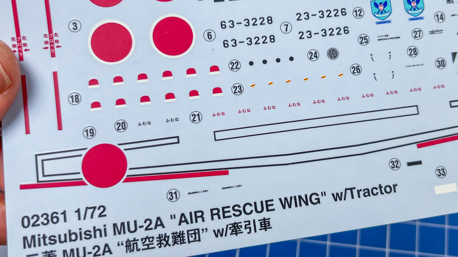 ふむなふむなふむな…まるで呪文のよう。自衛隊でも戦闘機だと英語で「NO STEP」って表記されるのを見てるので不思議。他にもプロペラの回転平面を示す「プロペラ」って書かれた赤ラインがある。この赤線の延長上にプロペラが回転しているぞ!超危ないぞ!っていうのも組み立てた機体に貼るとプロペラとの位置関係も一目瞭然で説得力高い(怖い)。日本語マーキングの面白さを満喫できるよ。