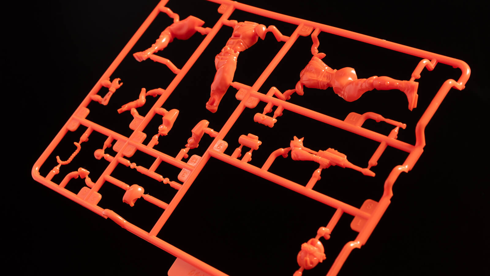 そして搭乗者の主人公、キリコ・キュービィー。フィギュアメーカーであるマックスファクトリーですから、こちらも素晴らしい造形でプラキット化されています。通常の顔とワイズマンを欺くために演じていた際の邪悪タイプ(キリコは演技も上手い)の顔がセットされます。台座も、ミニマムファクトリーシリーズで培われたヴィネット形式となっているので、キリコ単品としても成立するプラモとなっています。