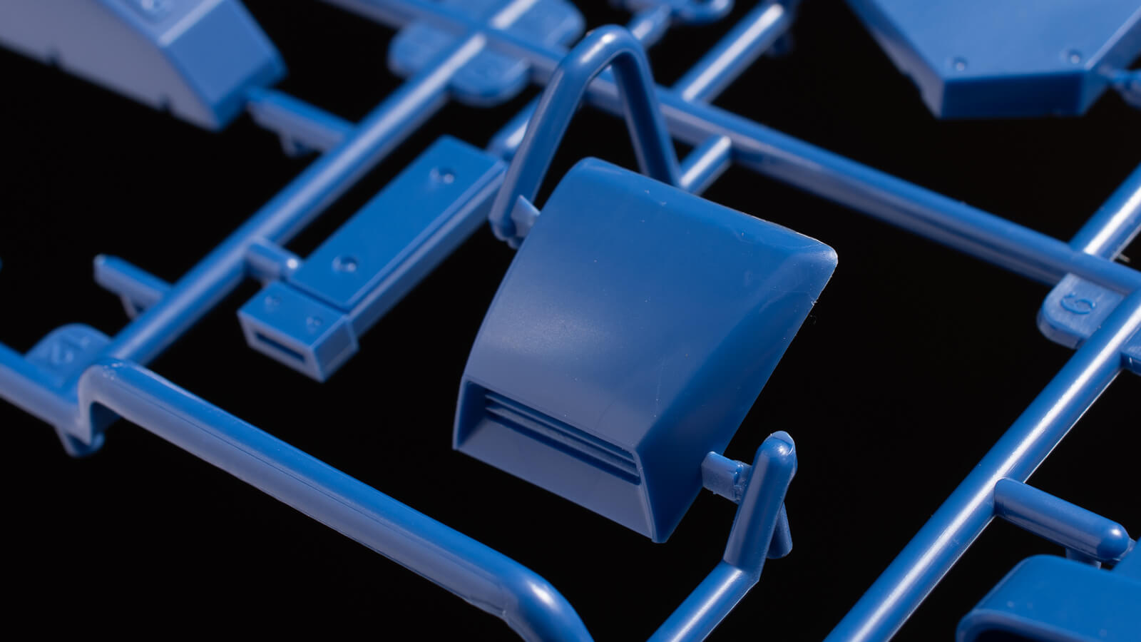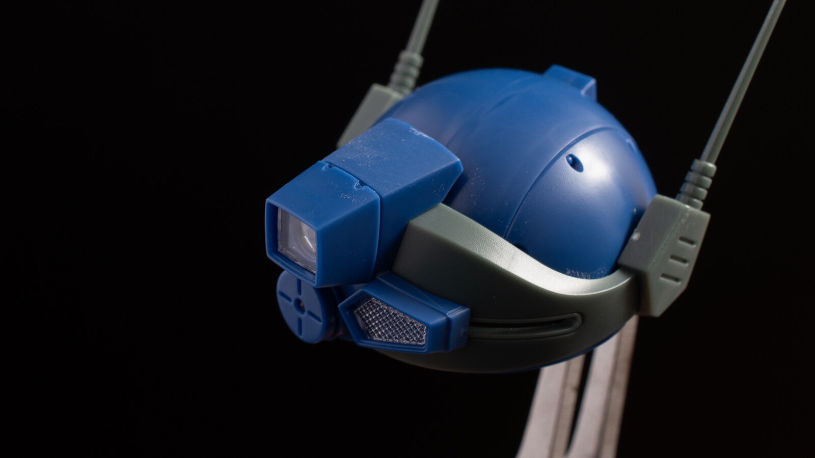 中央のカメラの曲面が非常に美しい流れでバイザーと融合しています。頭部の形状は、何度も修正を繰り返したそうで、説明書の中には最初期の頭部のCGデータから完成までの変遷も紹介されています。ぜひキットを組んだら、そのCGと見比べてください。