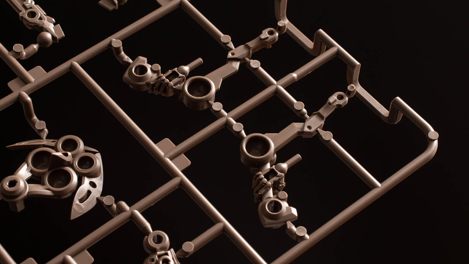 腕部のボルトも色分けと接続の両方を実現するパーツ構成となっています。しかしこうすると小さなパーツを確実に取り付ける必要があります。そのため、ボルトパーツは太く持ちやすい棒状パーツと一緒に成型し、取り付け後にゲートカットするという方式が取られています。このような組み立ての配慮も各所で見られます。