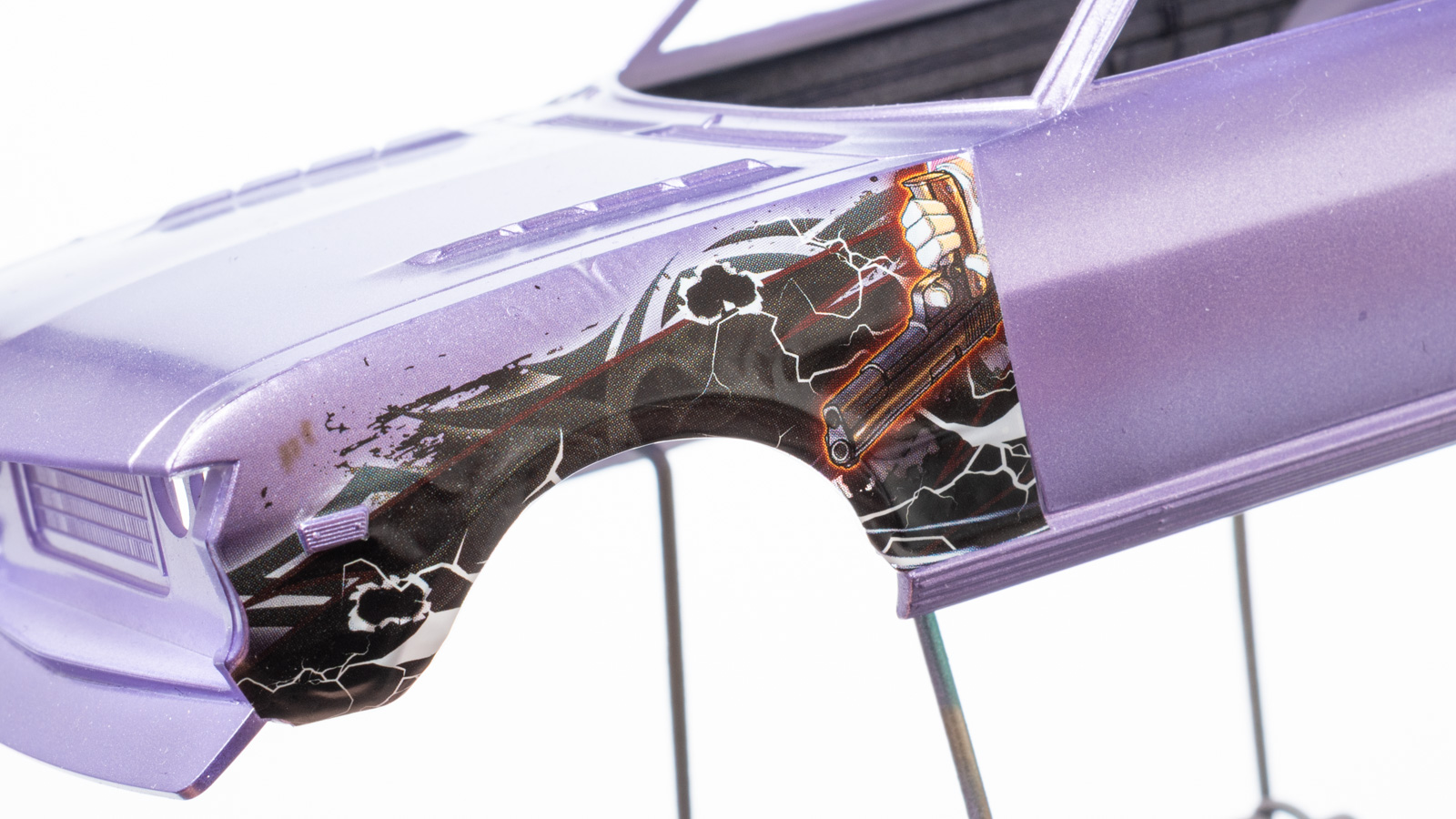 なにがすごいってデカールのアウトラインの精度ね。ドアのキワとボンネットのショルダーに合わせてデローンと貼るとこれでもかってくらいクルマの輪郭にビタッと沿ってくれます。そのかわりホイールアーチ部分はものすごく余裕を持って寸法が余らせてあるので、ここはヒートガンやマークソフターを使ってエッジ部に回り込むよう処理できます。この動作を4回やればビチーっとグラフィックが繋がって、ドアノブやサイドマーカー部分の切れ込みもボディパーツの彫刻と寸分たがわぬ位置に来てくれる。木型時代のプラモデルが持つ曲面に対し、どう設計すればこんなにバチピタなデカールができるのかよくわかりませんが、とにかく偉い。