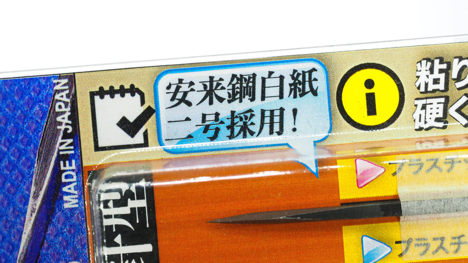 世の中の刃物の基本的な考え方ですが、硬さと鋭さは脆さとの選択式です。KISA-GUの素材は書かれているとおり白紙2号。包丁などでも非常にオーソドックスな素材で、硬度はもちろん、タングステンやセラミックより下ですが、その分粘り、頑丈さには定評のある素材です。針型という通り基本的には狭いところを先端の細いところを使ってこちょこちょやりたいので、そういう場合、鋼の特性が非常に生きてきます。硬い工具でも繊細な操作ができる人はいいんですけども。私も比較的力任せのゴリラなので。ウホ。ゴリゴリ削るウホ。