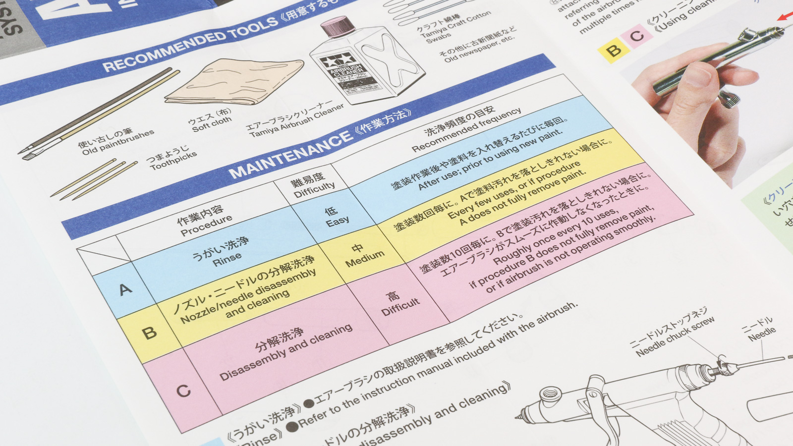 また内部には取扱説明書が入っています。これはタミヤ製のハンドピースの分解図に加え、メンテナンスの難易度別にどう作業するかの解説があります。とても丁寧な内容でこれを頭に入れればあなたもメンテナンス上手、という秘伝の書なのです。