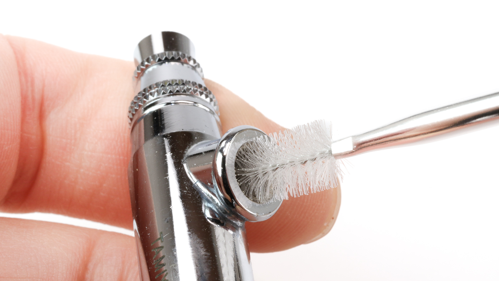 小サイズはノズル内部からカップまでの塗料の流路にピッタリで、これがもうみんな洗いたいこの場所を清掃する必殺の装備です。ブラシにごっそり塗料のゴミがついてきたときは、ちょっとした快感。耳かきで大きなのが取れたときのような気持ちになれます。