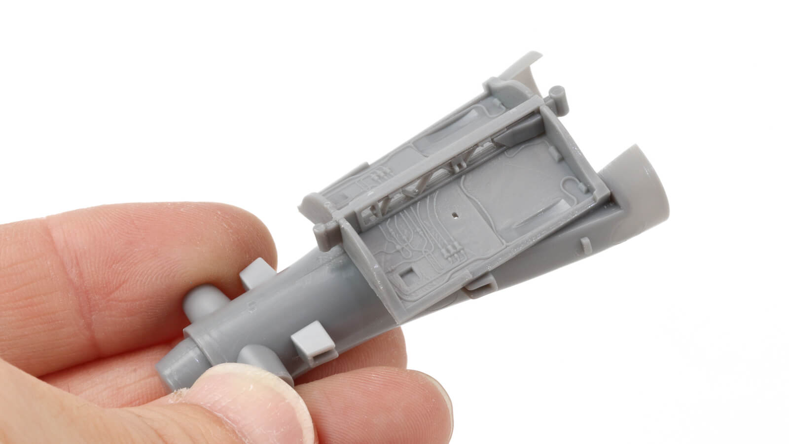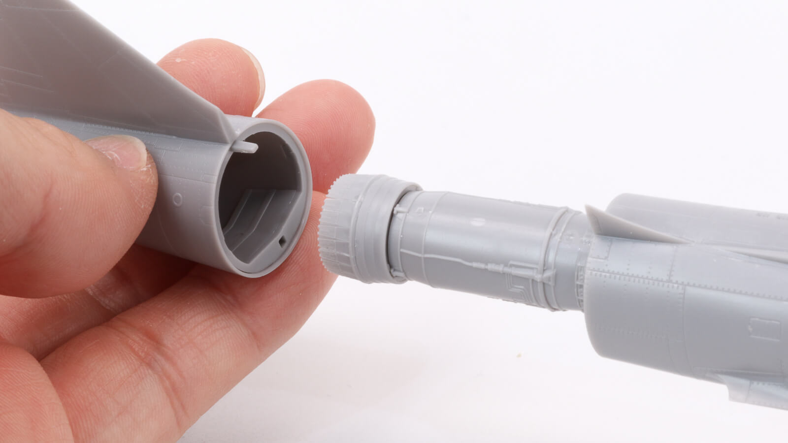 尾部もそれぞれピンが出ていて、差し込むと基本保持されます。尾部のパーツは一体化してここで分割することで垂直尾翼の角度が決まること、外したときにエンジンを魅せるギミックと、さらに外側の色が切り替わるラインという3種のメリットが享受できる本当に素晴らしいアイディアです。