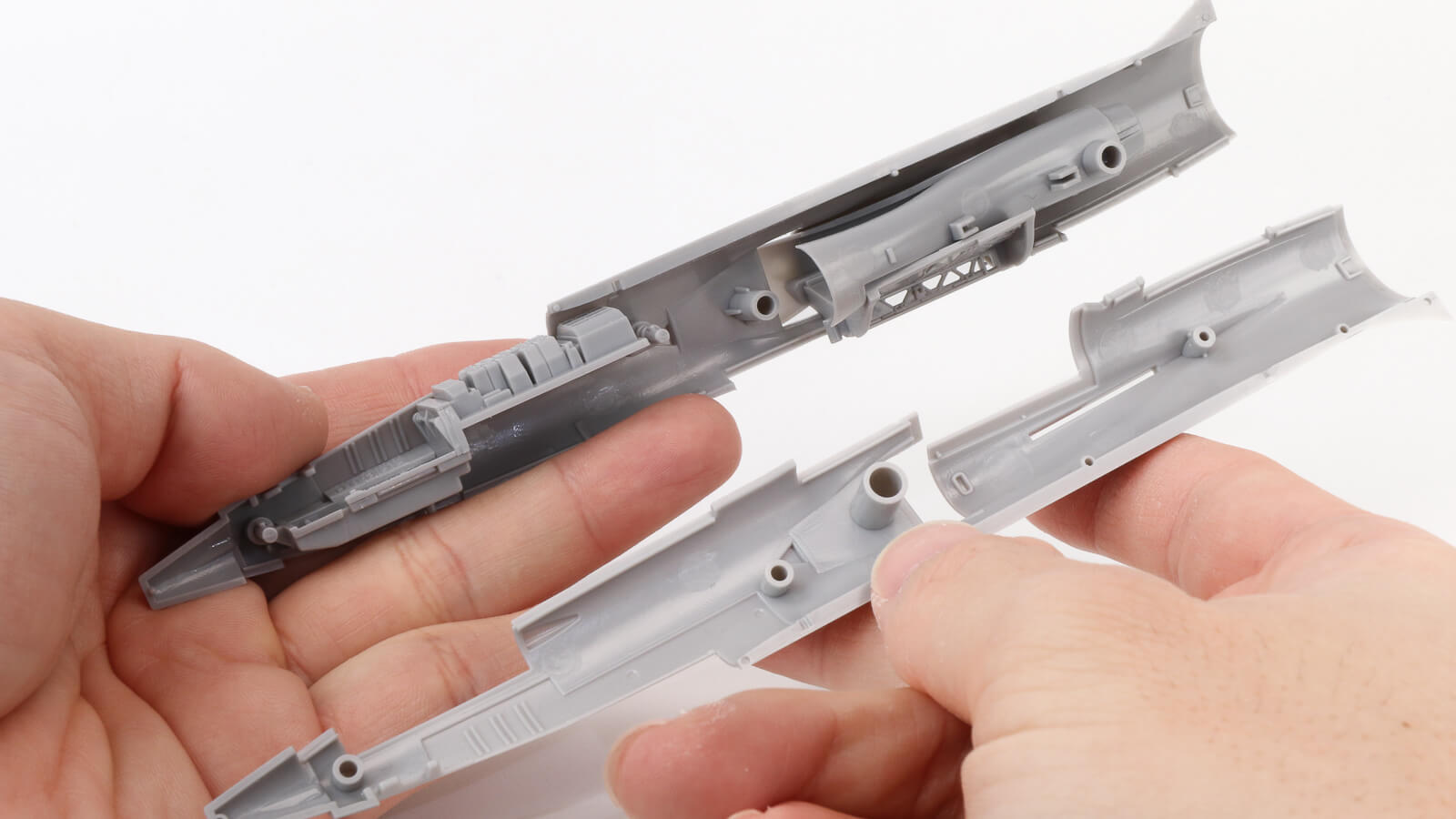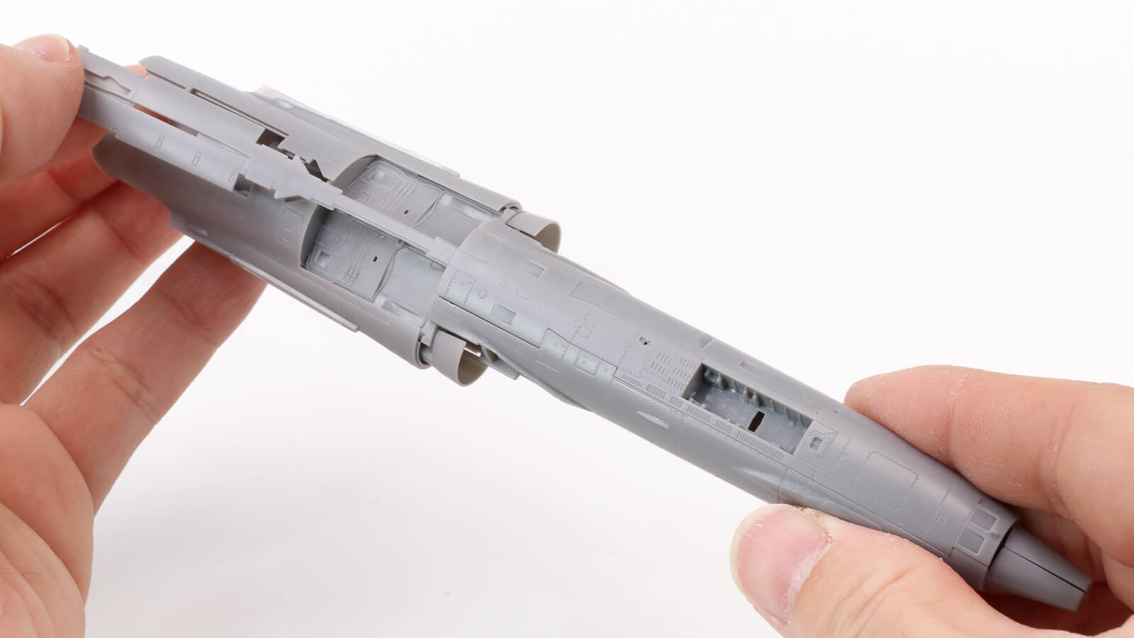 精度も抜群で、機体下面は機首下から後部まで一体のパーツなのですが、合わせ目がピッタリとパネルで隠れて見えなくなります。左手を離すとこの外装3パーツは合わせ目がほとんど見えない一体感になります。