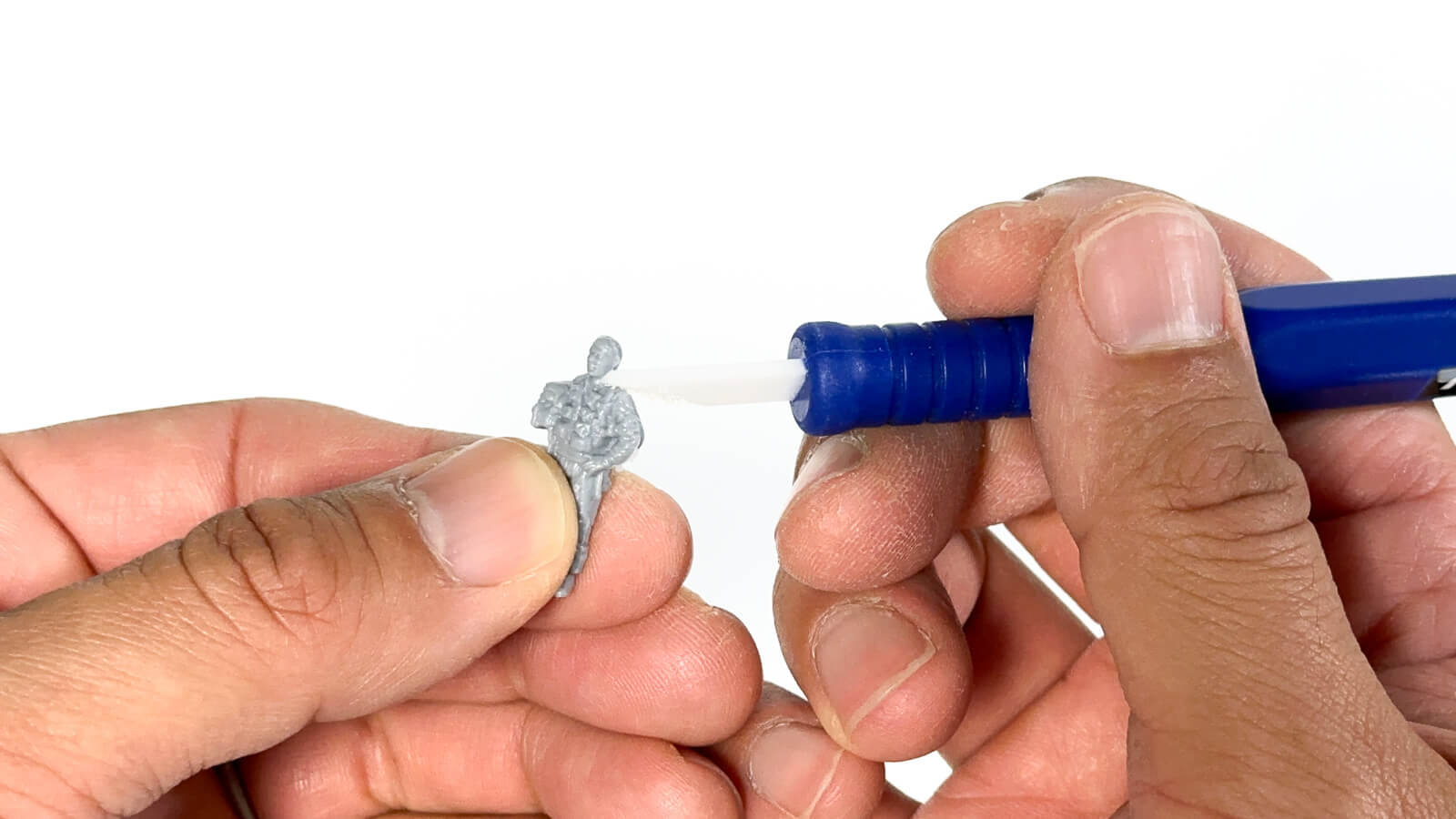 「ミラクルピックアッパー」は、弱粘着の芯で極小パーツをペチョっと吸着し、狙った位置まで確実に運んで押さえ込める鉛筆型ツールです。ピンセットだと飛びがちな丸いパーツや掴みどころのない部品に強く、面で保持できるので生乾きの位置調整もしやすいのが利点です。接着剤がパーツに付いていれば、貼り付け時は接着したパーツよりもツール側が先に離れてくれる粘着バランスも良好。芯はキャップ一体の簡易鉛筆削りで表面をリフレッシュでき、ナイフで先端形状を好みに削って密着性を上げることもできます。