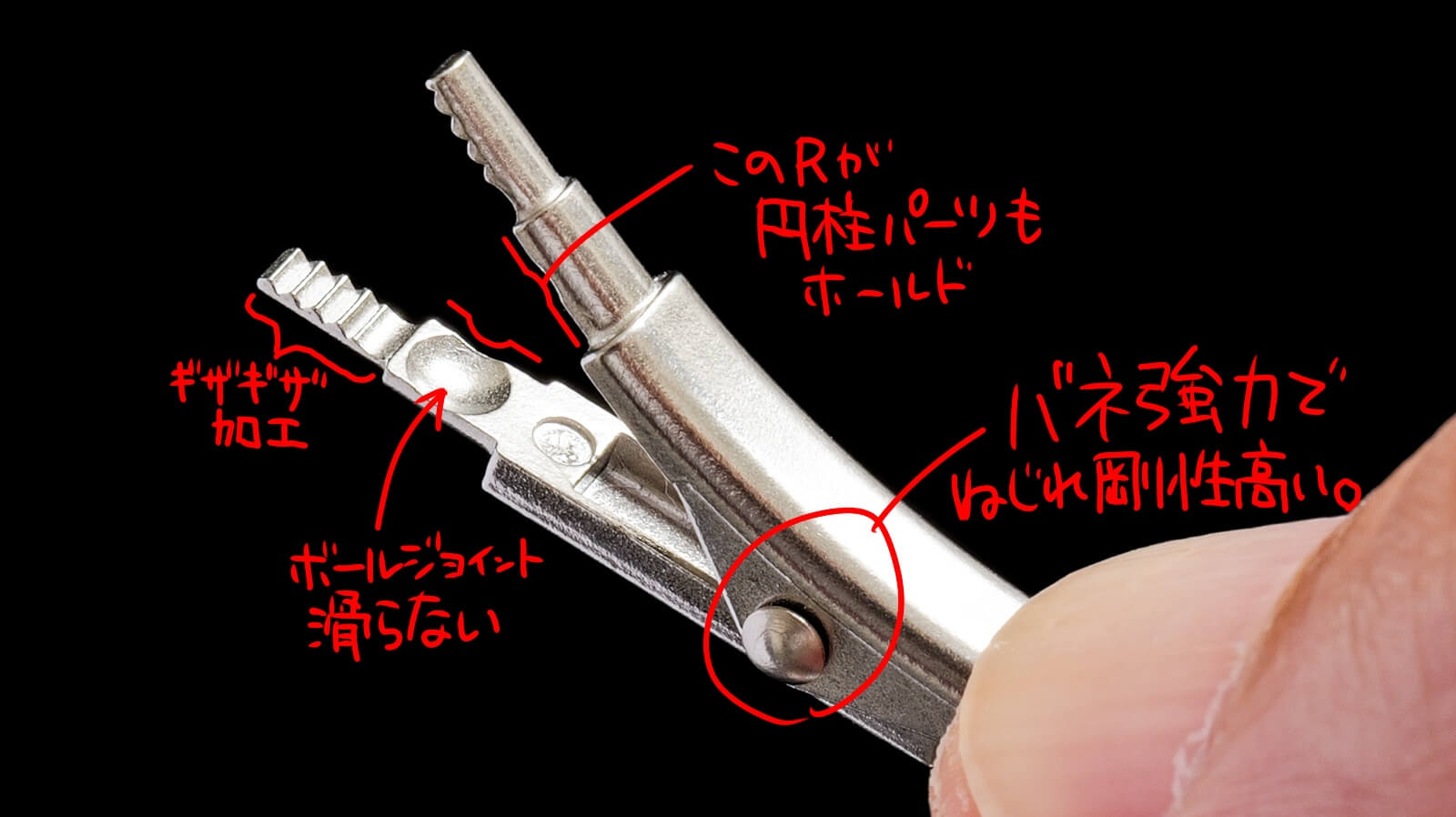 塗装クリップMasterは、先端が細く精密で、2mm/3mmのダボ穴に挿せたり、3mm前後のボールジョイントもしっかり掴める塗装用クリップです。滑り止め付きで風圧でもズレにくく、内側には球体・円柱どちらも保持できる溝があり対応力が高いのが特徴です。先端はレーザー溶接、軸はオールステンレスで溶剤洗浄も可能。持ち手側にネジ穴が切ってあり、専用マグネットをねじ込んで装着できるようになっています。