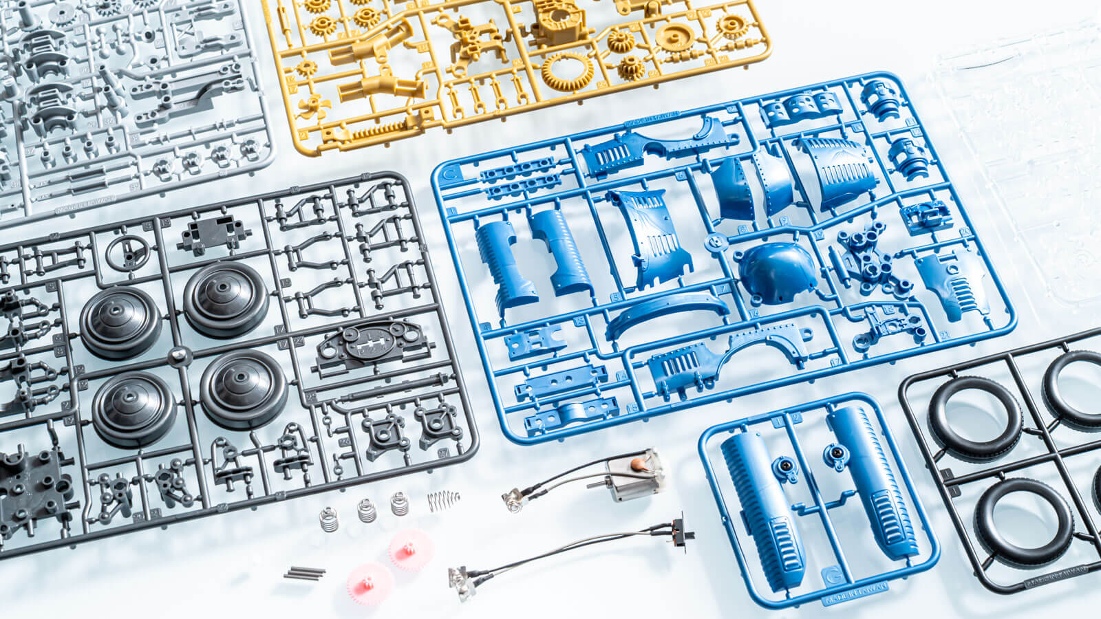 233パーツからなるこのキットとの出会いは、プラスチックで表現された美しいメタリックカラーのきらめきによって彩られます。外装、内部メカ、フレームはそれぞれの枠にまとめられていて、派手なゴールドとシルバーの駆動系、それを力強く支持するガンメタのフレームとホイール、そして完成時の印象を決定づけるメタリックブルーは玩具的な派手さというよりも極めて洒脱な、調和の取れた色調でまとめられています。表面を不定形に走るウェルド(プラスチックが金型のなかで冷え固まるときにできる紋様)すらも美しい!