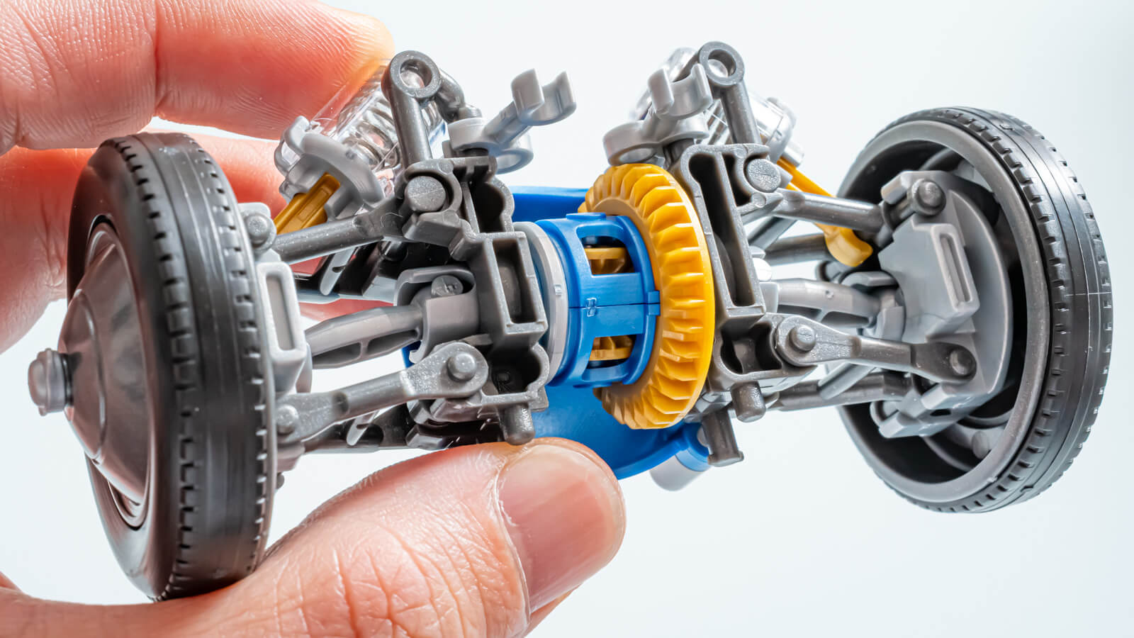 リアアクスルの真ん中にデフが鎮座し、平行等長のダブルウィッシュボーンが車体側とハブを繋いでいます。ユニバーサルジョイントのように動くドッグボーンを介してカップジョイントの回転がホイールへと伝わるので、サスペンションの動きに追従して動力が伝達される……という仕組み。左右のタイヤの回転差、地面の凹凸、コーナリング時の沈み込みにそれぞれ対応しながら走り続ける仕組みが体感できます。ネジや接着剤を使わずに……!