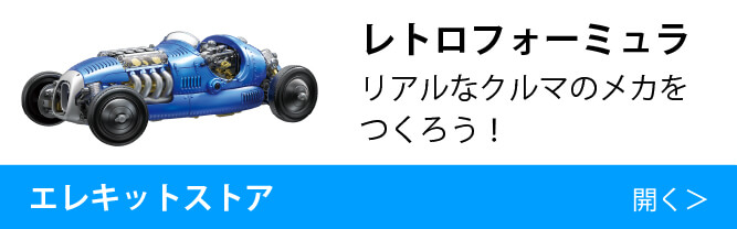 パーツを切り離してパチパチと嵌めていくだけで、実際に走行し、変速し、ステアリングが切れてサスペンションが作動し、透明なV8エンジンのなかで黄金のピストンがせわしなく上下する……。昨年発売されたプラモデルの中でもいちばんの思い出になったのがエレキットの「レトロフォーミュラ」です。このnippperでもいちど紹介しているのですが、あまりにも面白い体験だったのでいまいちど皆さんにその存在をお伝えしたい。まだ手に入れていない人は、この機会を逃さないよう強くオススメする次第なのです。