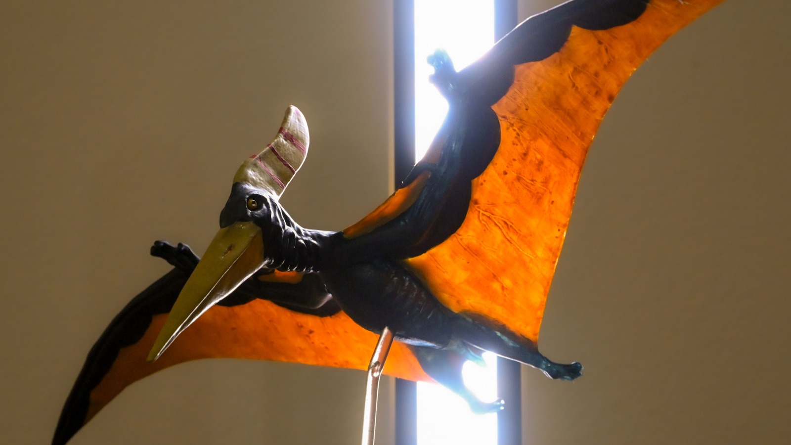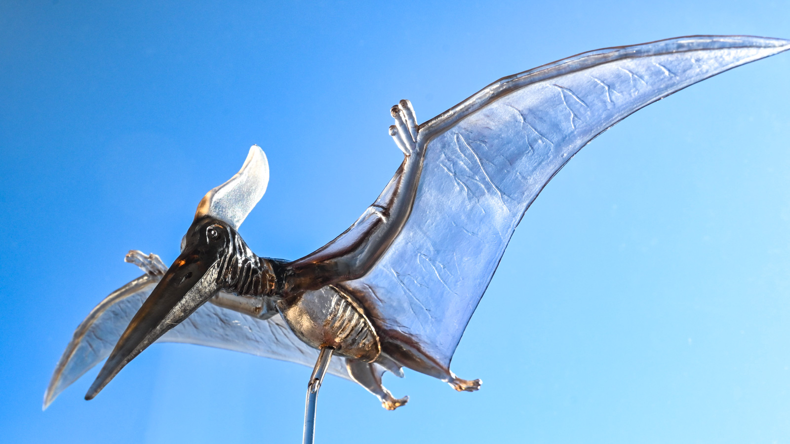 その決意を胸に、塗装を開始。恐竜は自由に塗装できるモチーフなので、自分を信じて思うままに塗るのが吉です。翼の透け感がなくならないように注意しつつ、塗料がのるギリギリに薄めて重ねていきます。均一には塗れていないので筆ムラが生まれましたが、光にかざすとうっすらと透けて、結果的には良い着地を迎えました。