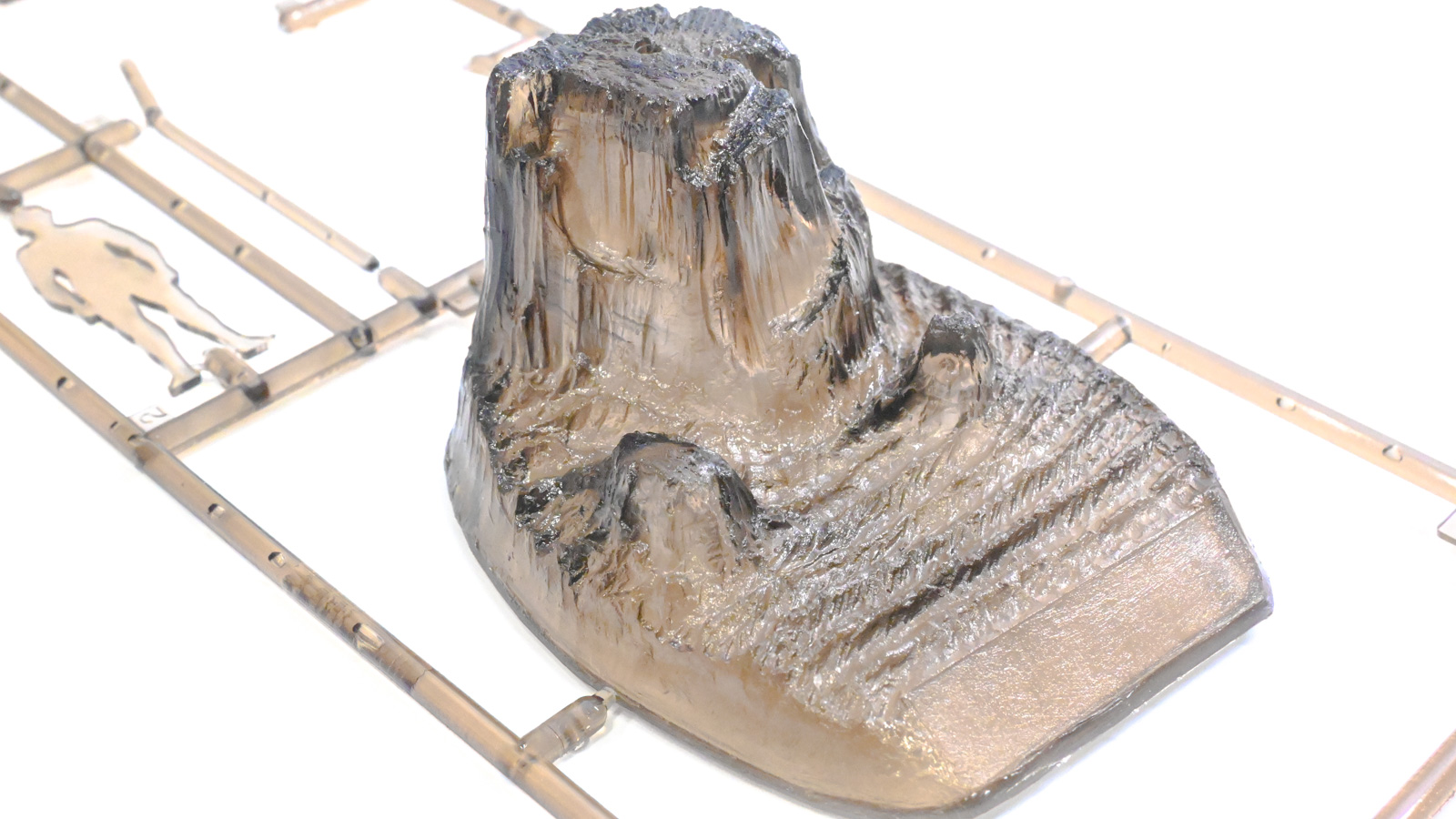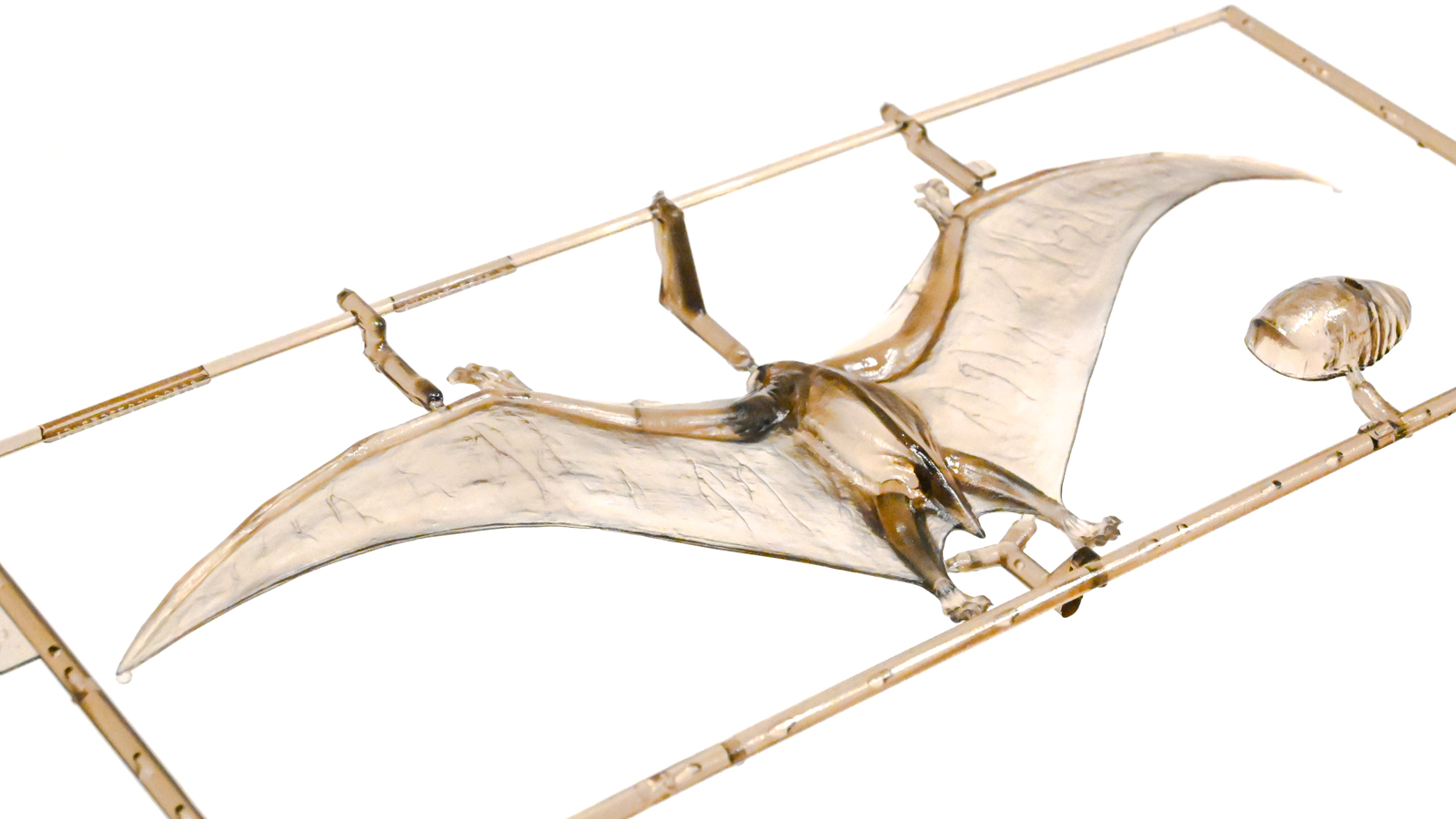 しかし、ここからが本題。このプテラノドンは全身が淡いブラウンのクリアパーツで成形されています。これには思わず唸りました。ぼくの中でクリアパーツといえば、飛行機のキャノピー(窓)などワンポイントで使われるイメージだったからです。
