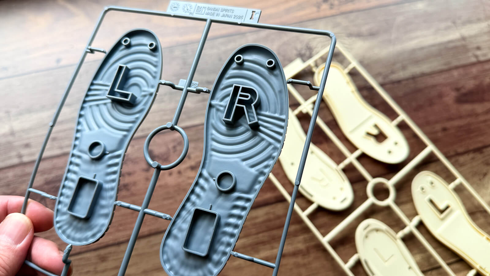 その他にも靴のセンターに対して外装(?)の左右の貼り合わせを間違えないよう、右側は「四角穴」、左側は「丸穴」と形状がそろえられていたり、シューレース(靴紐)パーツが靴のつま先側から順番にランナーに配置され裏側には 1, 2, 3…と番号も入っていたりとグローバルデザインな造形になっている。プラモデルに慣れていないスニーカー好きの人が購入した場合でも組み立てやすくするための配慮なのだろう。すばらしい。