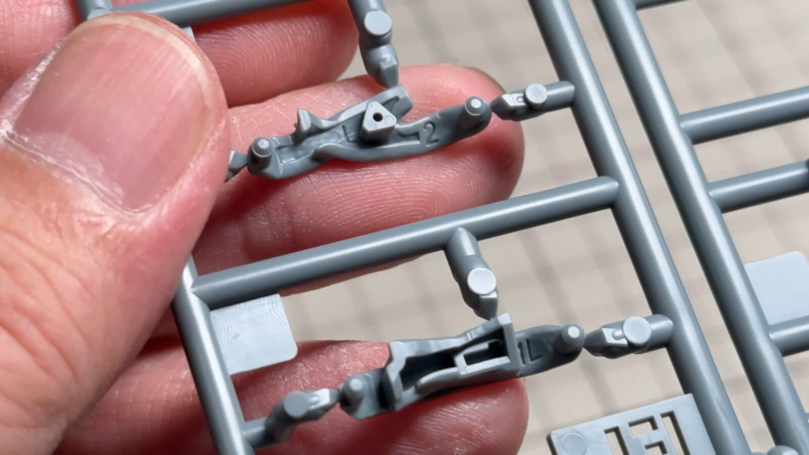 普段ガンプラを作る事が多い自分には違和感しかない「奇々怪々」な形状のパーツがランナーに収まっていて、一見するとどこの部位のパーツなのか判断が付かない。ましてや同じデザインが鏡転されたパーツ構成になっているので混乱しそうなものだが、説明書に記載されているパーツナンバーとは別に恐ろしいほどシンプルな方法で左右がわかるようになっていた。