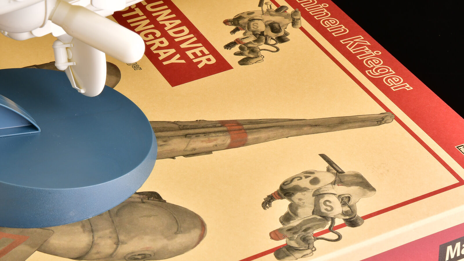 そんな時に登場するのが、35マシーネン大型モデルの雄。ハセガワの「ルナダイバー スティングレイ」です。スティングレイに傭兵軍シーカーなんて付いていたっけ? そう思われた方、そうです。本体には傭兵軍シーカーは付いていません。しかし、このキットには名脇役達が入っています。横山氏によるボックスアートにも描かれている宇宙用の装甲戦闘スーツ「ファイアボールSG」と、その偵察・電子戦型の「SGプラウラー」です。キットには、1/35でもスティングレイの巨大さがより実感できるように、同スケールの2機も付属しています。傭兵軍スーツの偵察型といったらそうです。シーカーです。