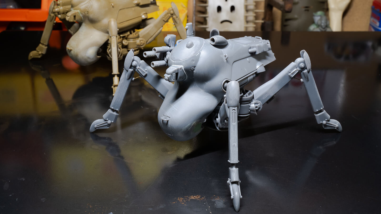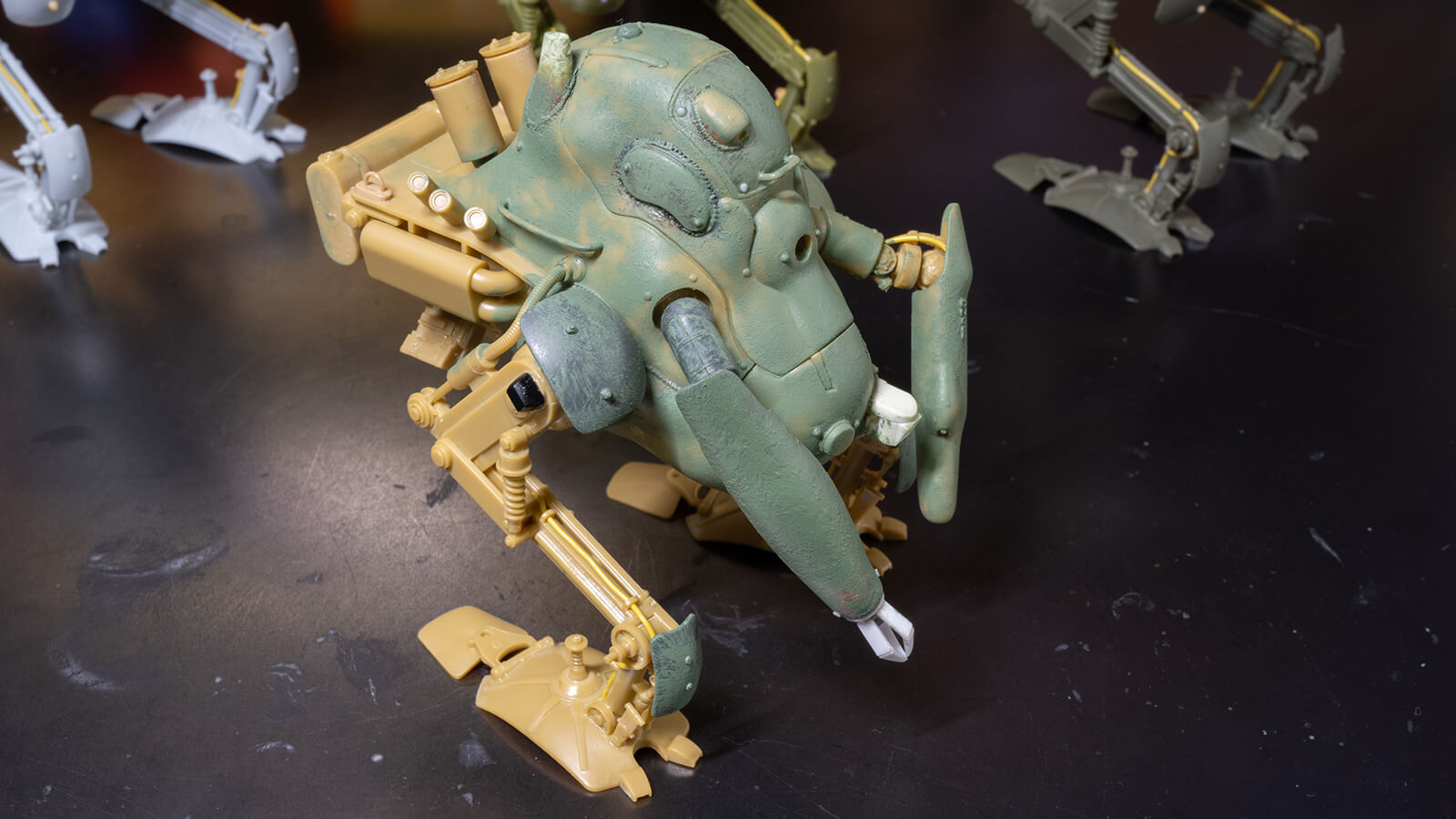 1/20スケール想定でアーティストモデルが制作され、そこに1/48スケールのディフェンダーからパーツが流用されたという経緯から、1/35スケールに合う程良いサイズで同形のシーカーを既存のスケールモデルから探し出すのはたいへんです(ご存じの方、ぜひ情報お待ちしています!)。35マシーネンでまず思い浮かぶのは海洋堂ARTPLAのグラジエーター。傭兵軍の4足歩行型重装甲戦闘スーツとして人気の本機には、ラインナップされている各型にシーカーが付いています。ですが、機体デザインとして特にグラジエーターのシーカーは外し難いところなので、ここから流用するのは少し考えどころかもしれません。