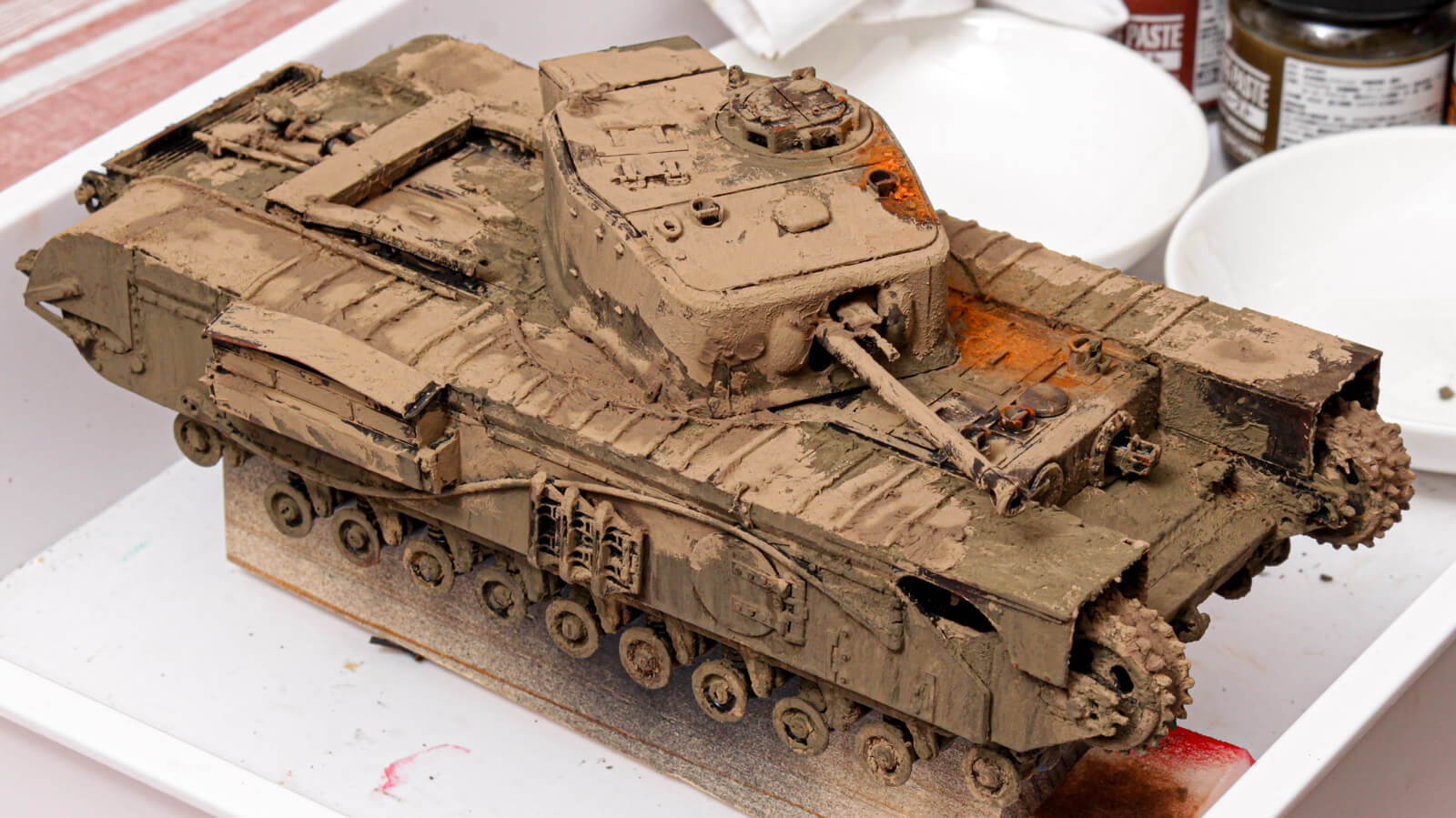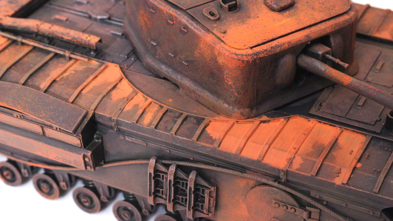 ボロボロに錆び、土まみれ泥まみれのチャーチルは妙な迫力があります。様々な素材を使うことでプラスチックの塊からどんどん離れて行く、道具によるプラモデル表現の進歩の要素を強く抽出した仕上がりとでもいいましょうか。汚しまくりの経験は次のプラモにもっと生かされることでしょう。