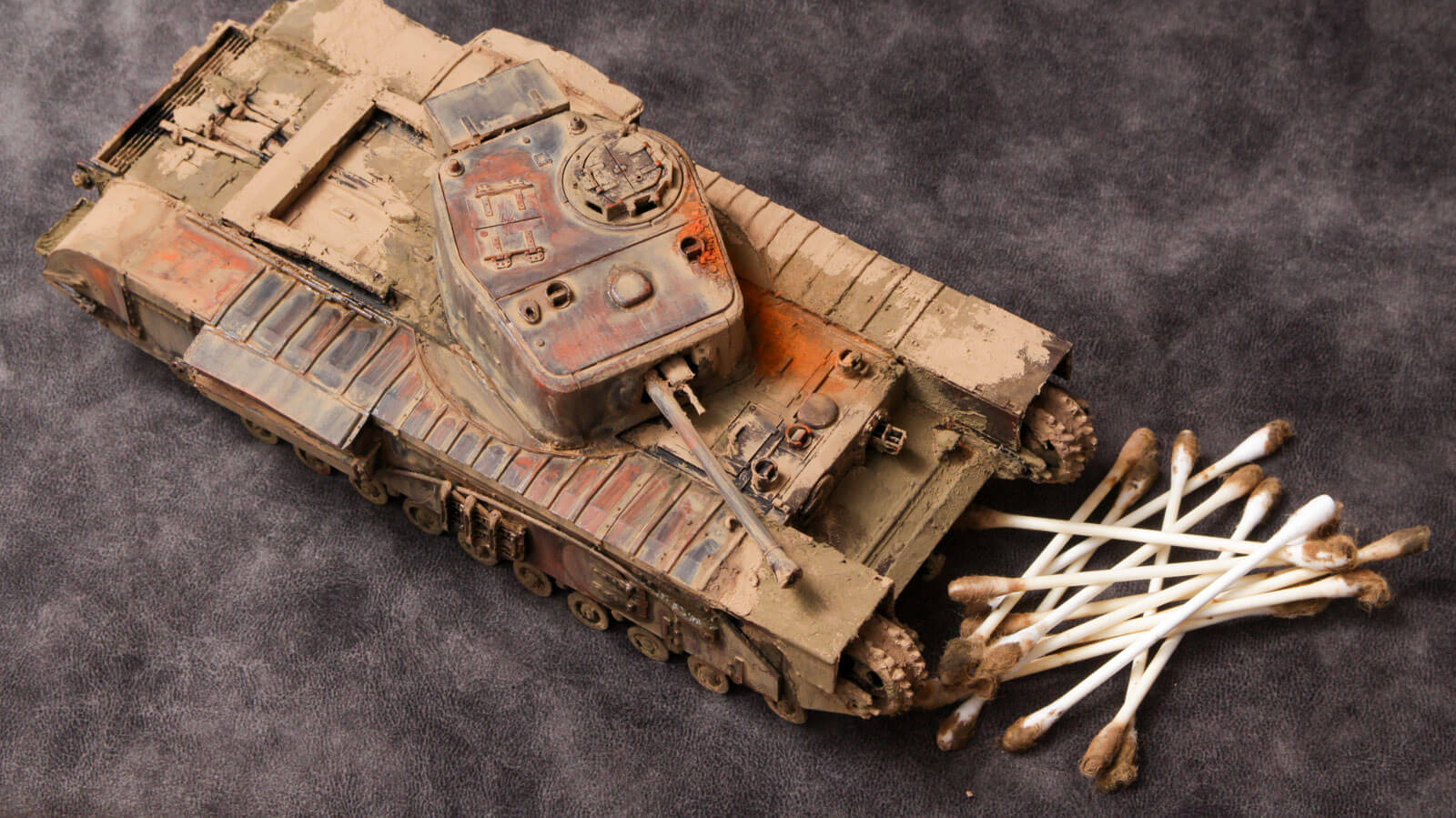 戦車についた汚れはウェザリングカラーのうすめ液と綿棒を使ってどんどん落としていけるのかと思いましたが、あまりに盛り過ぎるとそういうわけには行かず、筆でうすめ液を全体に塗りつけてから綿棒で拭き取った方が良かったです。あと、全体的に砂が被ったようになると、戦車の色自体が目立たなくなるので、鮮やかに仕上げておいた方がメリハリがついて良さそうです。