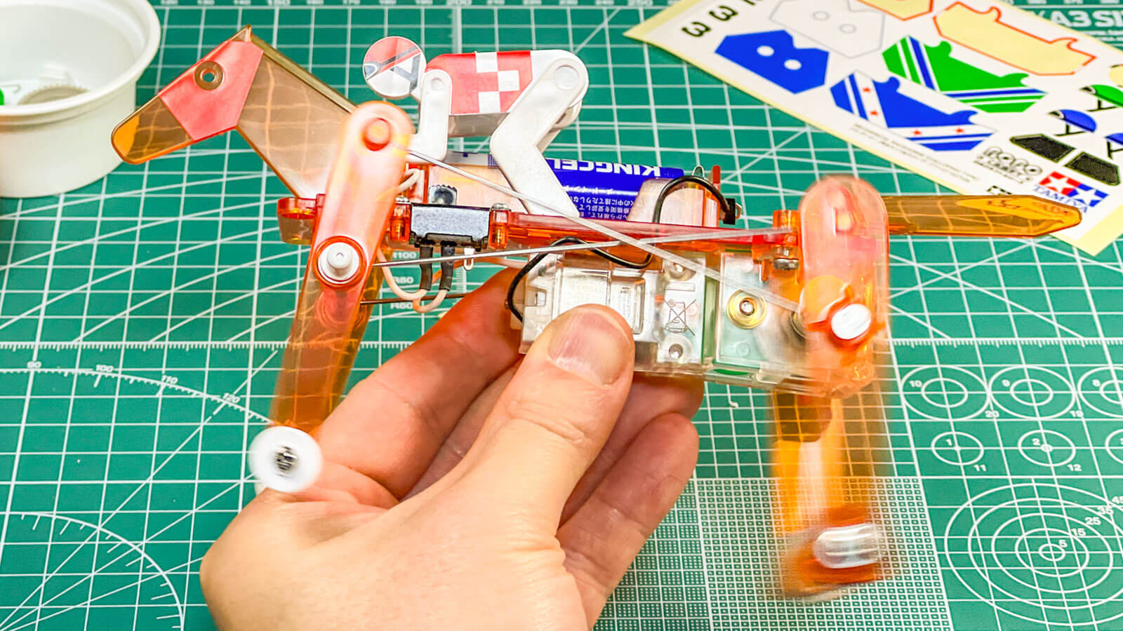キットが間違えやすく初心者向きでないとかそういうことではない。初めて組む子供のほうが先入観なく正しく組める可能性すらある。金属線でシャフトへ通す順序や交差させながら互い違いに組む片側2本のリンク機構となかなかに読解を要求してくる構造で、正しく組めたことを称えたくなるくらいの組みごたえが確かにある。