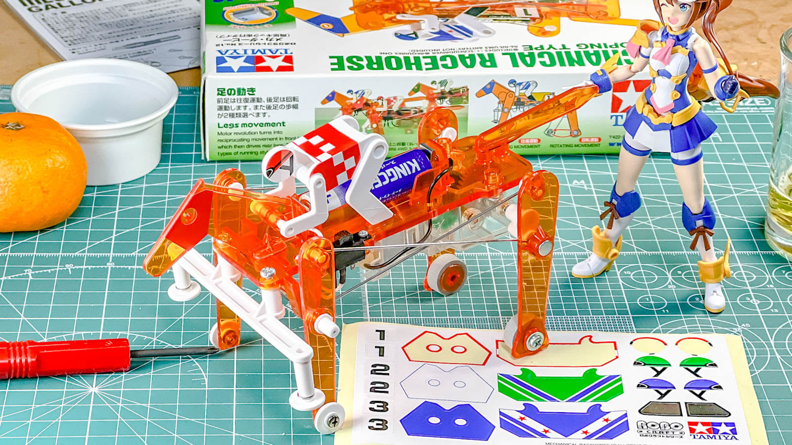 「左右の足を交互に前に出す」ことで歩くのではなく左右の脚を揃えて地面を蹴って前進する。左右の後脚は同調して地面を蹴るのでギヤボックスから生やすクランクも左右でずらさず揃えた位置で組み立てる。昔ながらの4足歩行ロボットを経験している人は無意識にクランクを180°ずらして組みがちなのだけど、そんなことをしたらこのキットは馬のように走るどころかまともに駆動しない。さらに正しく組めている場合でも脚が後ろに向かって進むような動きに見えるので「え、これホントに走るの?」とさえ思ってしまうけれど床に置けば「歩く」ではなく「脚で走る」機構の面白さを披露してくれる。ほんとに馬のように走る!タミヤ公式の紹介動画が秀逸なのでそちらも参照してみてほしい。