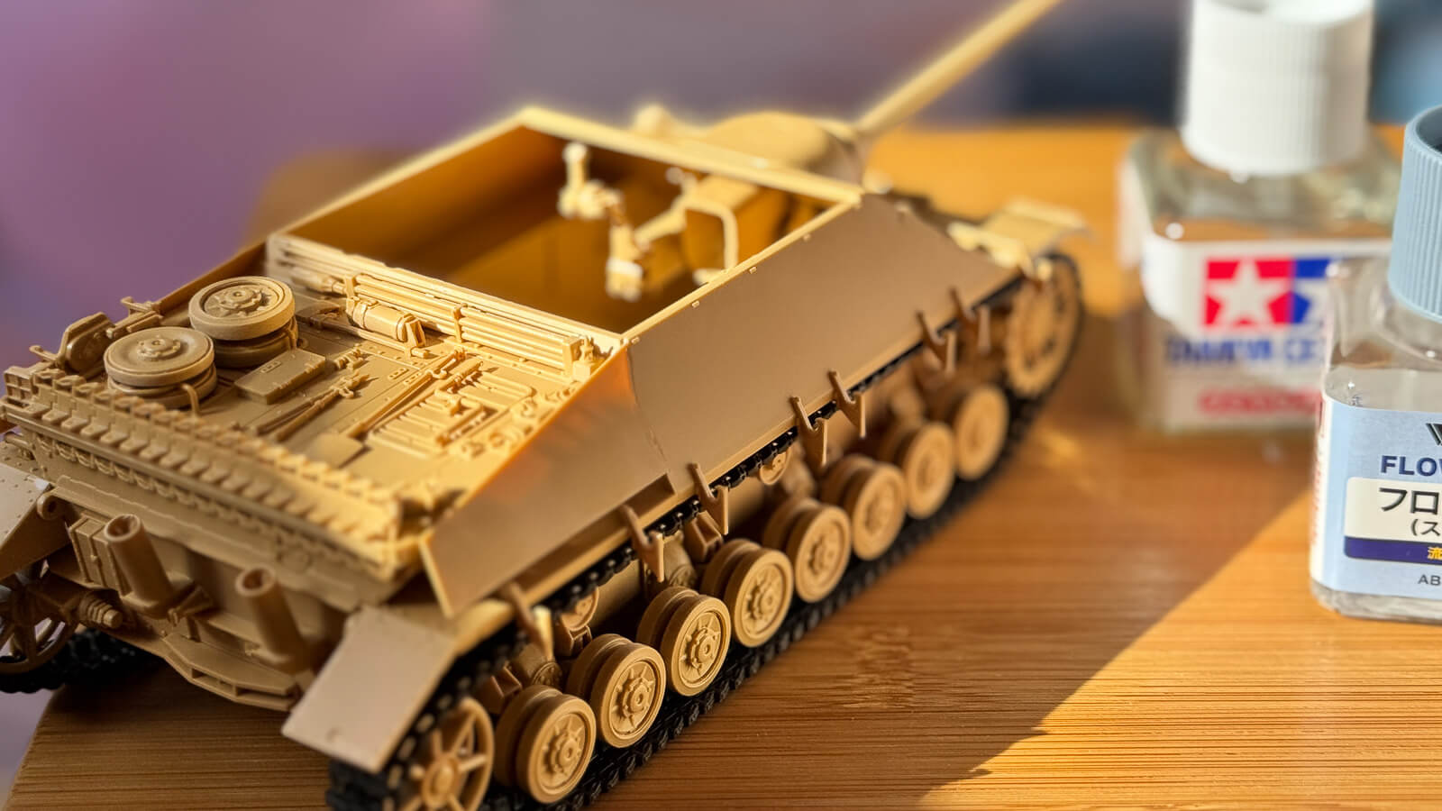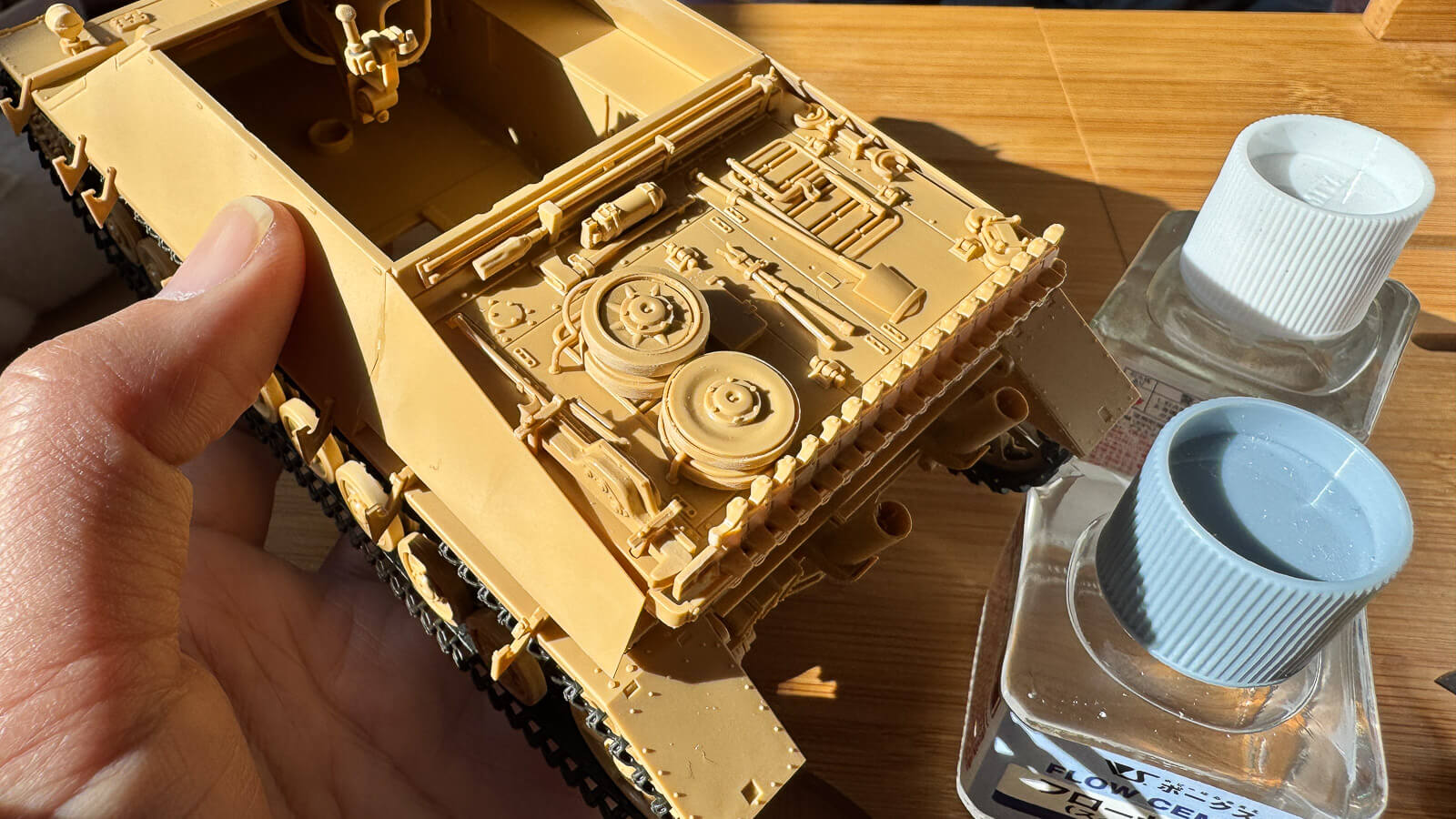 プラモを手に持って、じっくり見たい場所に光を当てる。すると戦車に搭載されたさまざまな装備がくっきりと浮かび上がってきて、普段の模型机でみる雰囲気とはより解像度が高く見えてくる不思議な感覚に陥ります。プラモを手の上でくるくると動かしているだけで、さまざまなワクワクが僕の目に飛び込んできます。
