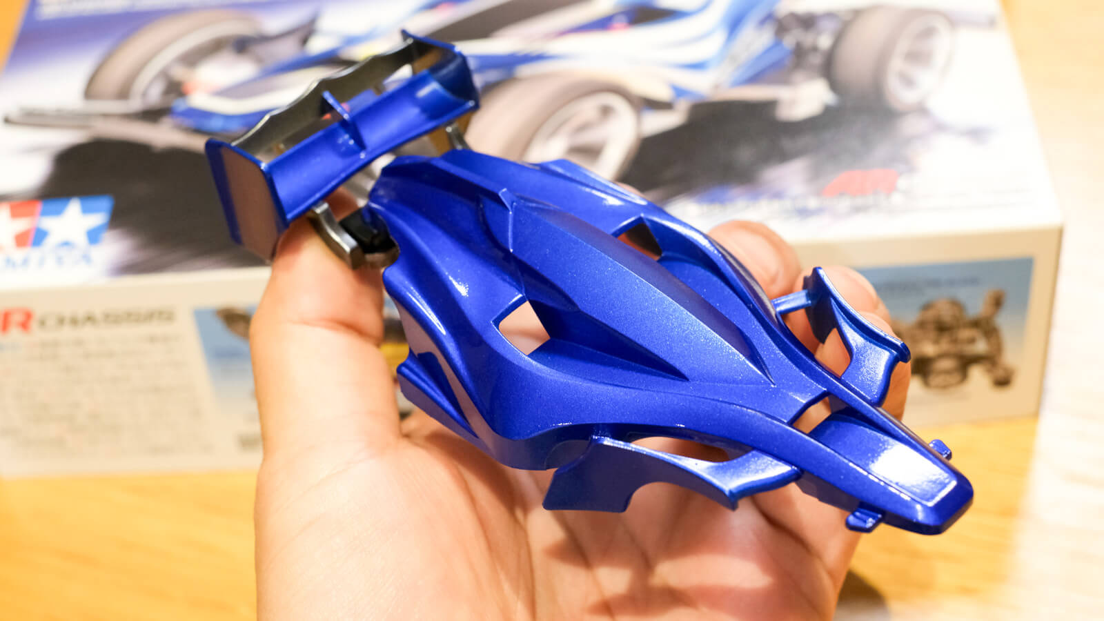 でもなんだかミニ四駆のエアロアバンテとは印象がちょっと違う。「なぜ?」と思っていたのですが、もしかして色が違う? こちら、深いメタリックブルーの色合いなのですね。この色が凄く良い色。ウィングの翼端板の内側もガンメタリックな色合いになっていてこれも良いアクセントになっている気がする……。