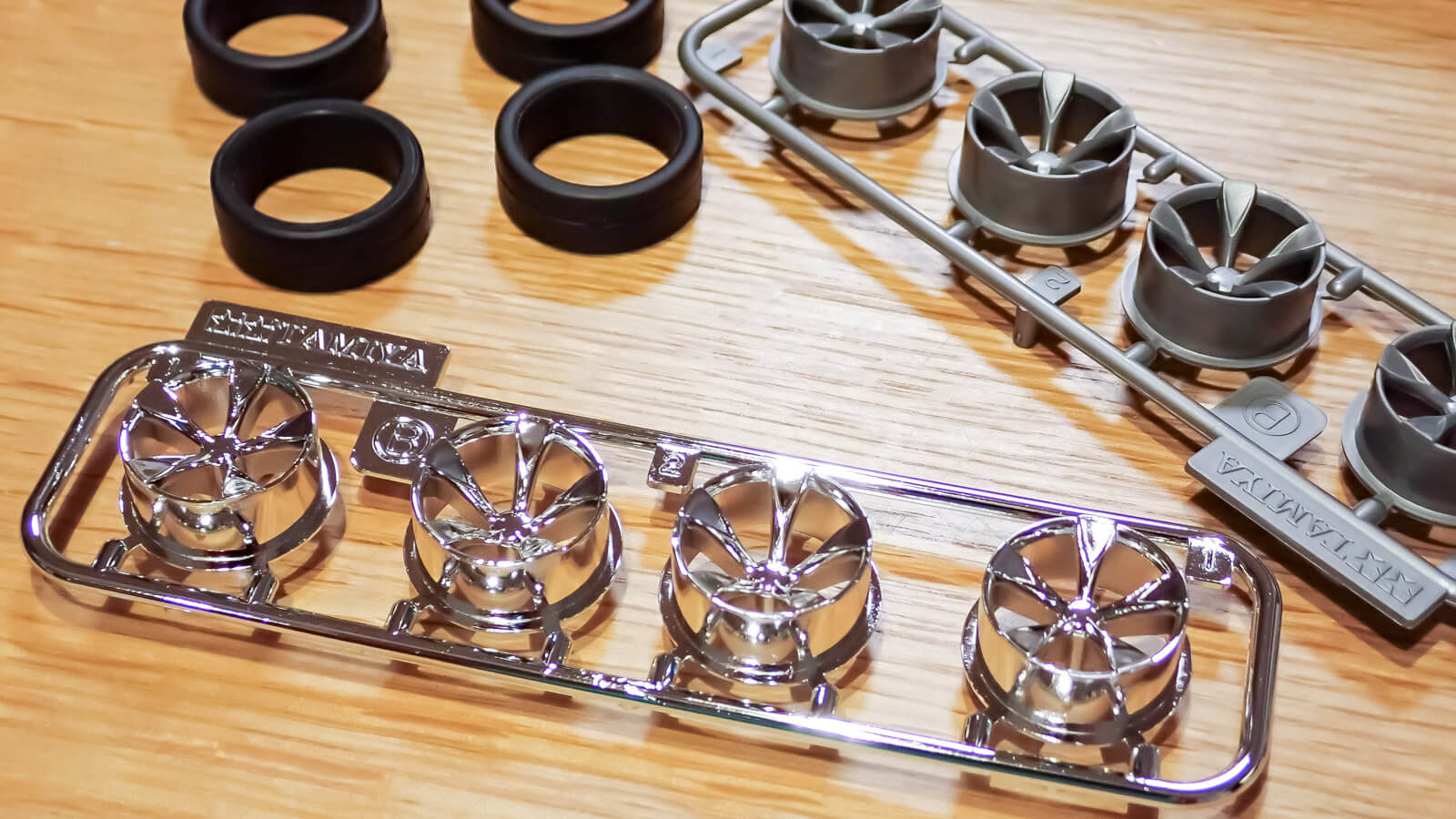 こういうのは気持ちが熱いうちにつくらないと積んでしまいそうなので家に帰れば早速制作開始。キット付属のホイールは色が違うし塗るしかないかな?と思っていたのですが、手持ちのホイールでちょうど良いメッキホイールが見つかりました。サンキュー過去の自分!