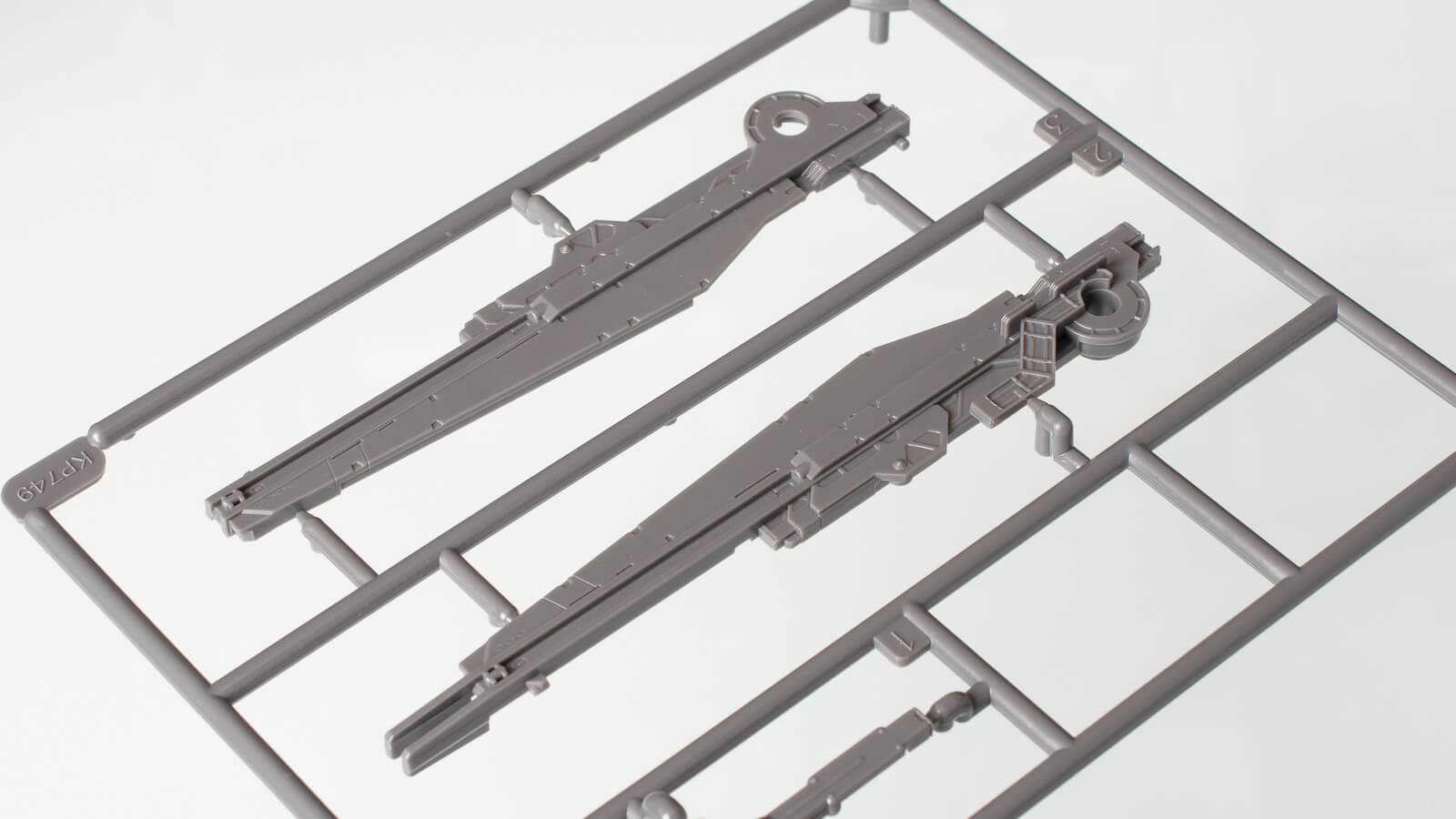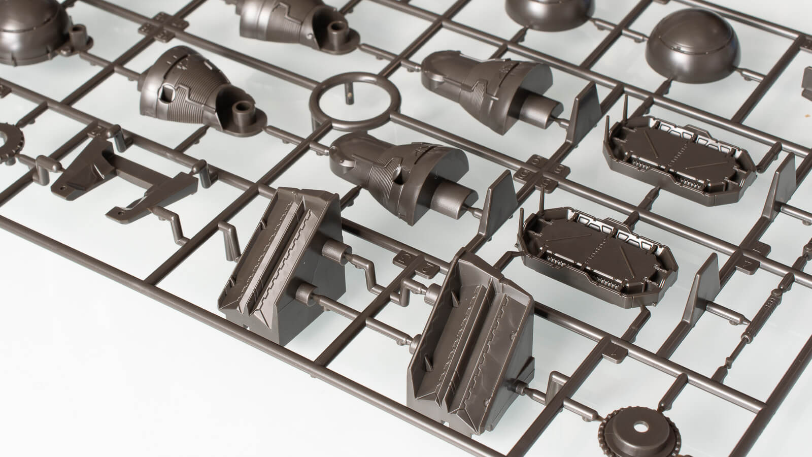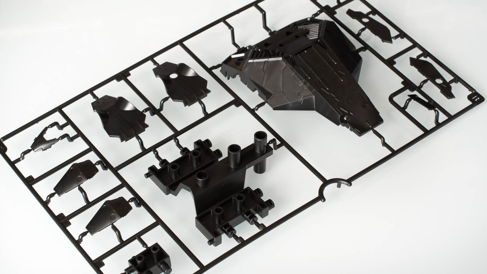 機体後部左右のコンテナや船体前部、側面パーツのランナー。船体上面パーツのように、機体デザインにおけるディテール、パネルラインの多くをパーツの接合部として用いることで、極力合わせ目消しを必要としない現用設計を随所に見ることができます。