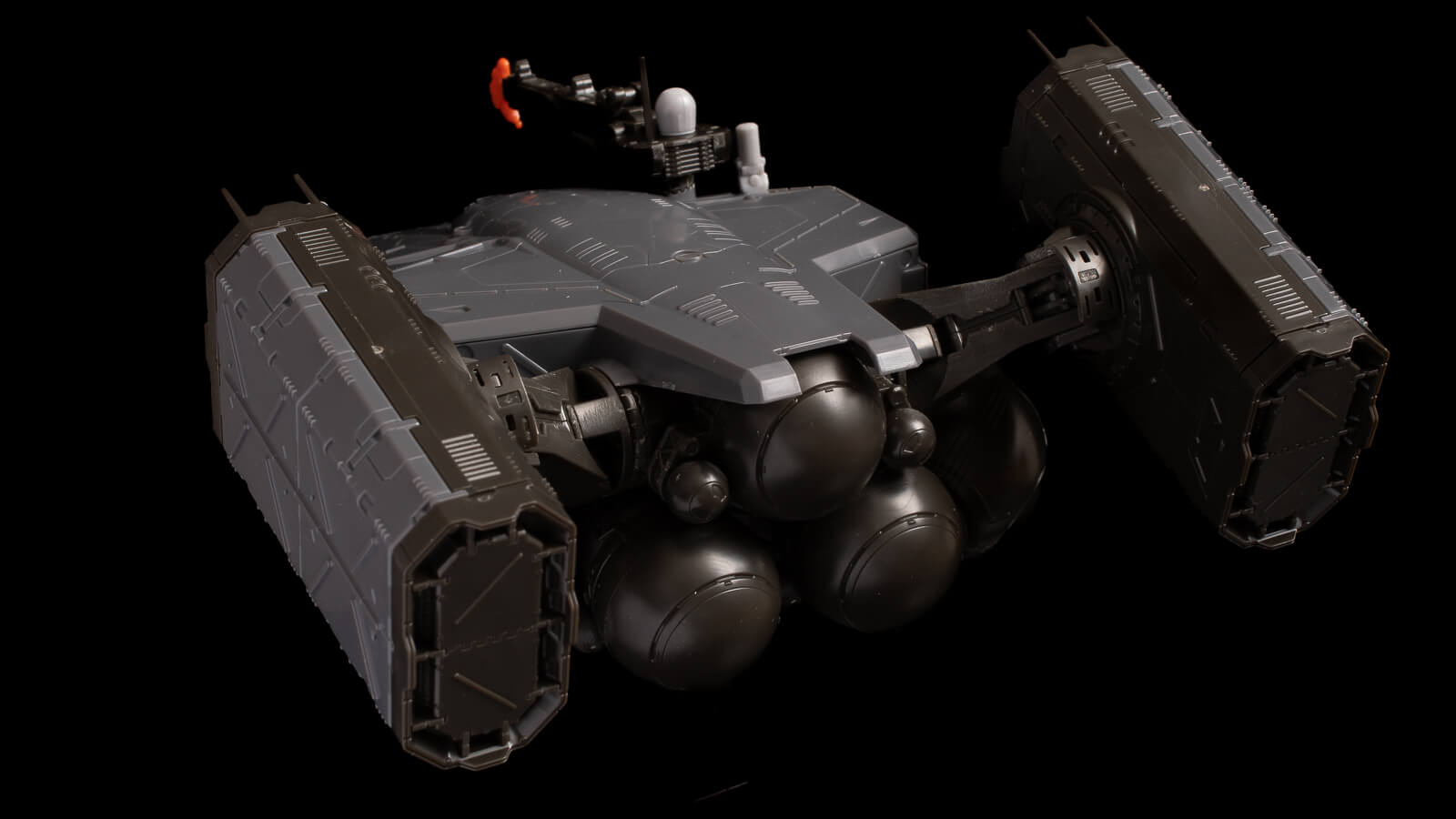 機体前方は現実の沿海域戦闘艦や強襲揚陸艦を想起させる印象となっていますが、これに対して後方は球形ユニットの集合によって、SF的でより近未来のテクノロジーを感じさせる宇宙船的な印象も感じられます。こうした変化をシームレスに体感することができるのも、立体としての本キットならではの醍醐味です。