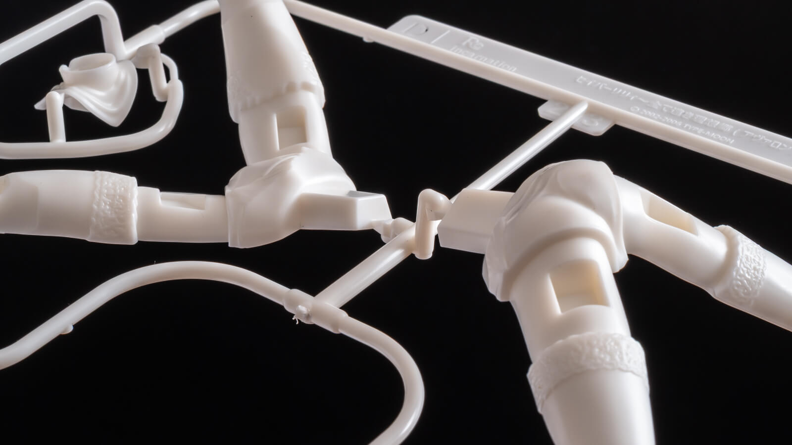 そして一番おもしろいのが、完成品をそのままバラしたのではなく「プラモデルに翻訳する」ための割り方が入っているところ。PVCで成立していた一体表現は、硬質プラにすると厚みや抜きの条件が変わるから、そのままではプラモデルになりません。だから胸のアーマーが付いていないドレスのラインがどう繋がっているのか、リボンの厚みをどこで前後に割るのか、肌の部分をどこで分割して破綻を避けるのか、そういう設計的な判断が随所に見られます。完成品の時代には見えなかった設計の意志が、接合線やパーツ構成として現れてくるのが、プラモデル化のいちばん美味しいところです。