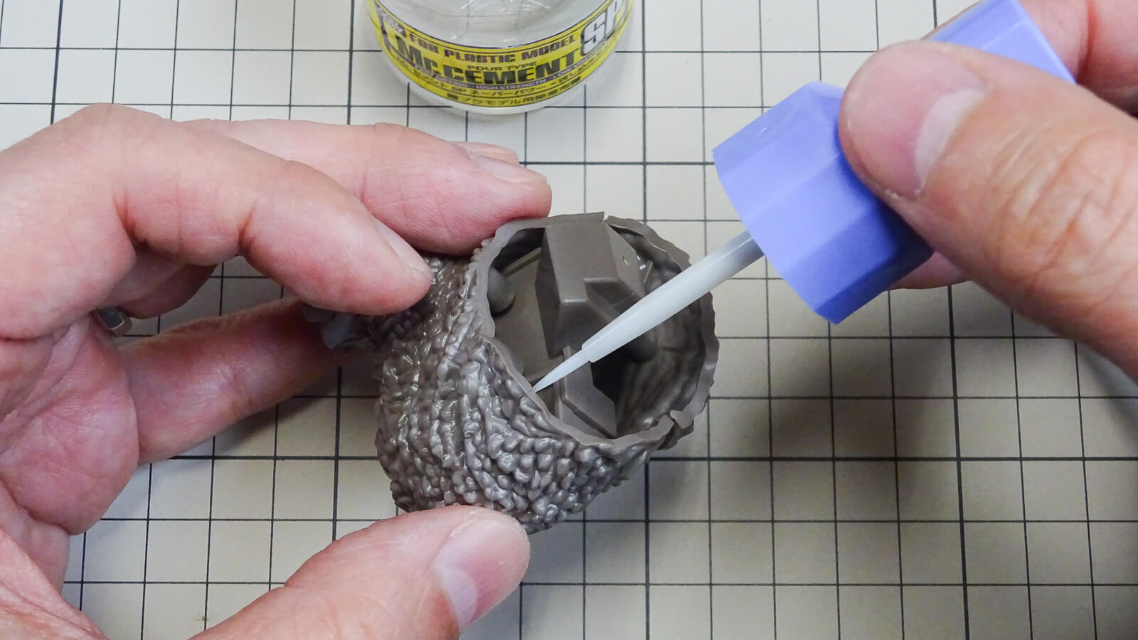 流し込み接着剤はゴジラの表皮間に流れ込まないように、できればパーツの裏側で塗布した方が良いかなと思い、写真のような感じで接着剤を流していきました。