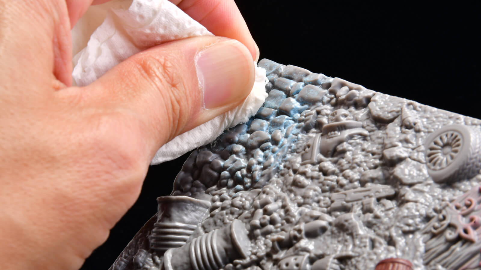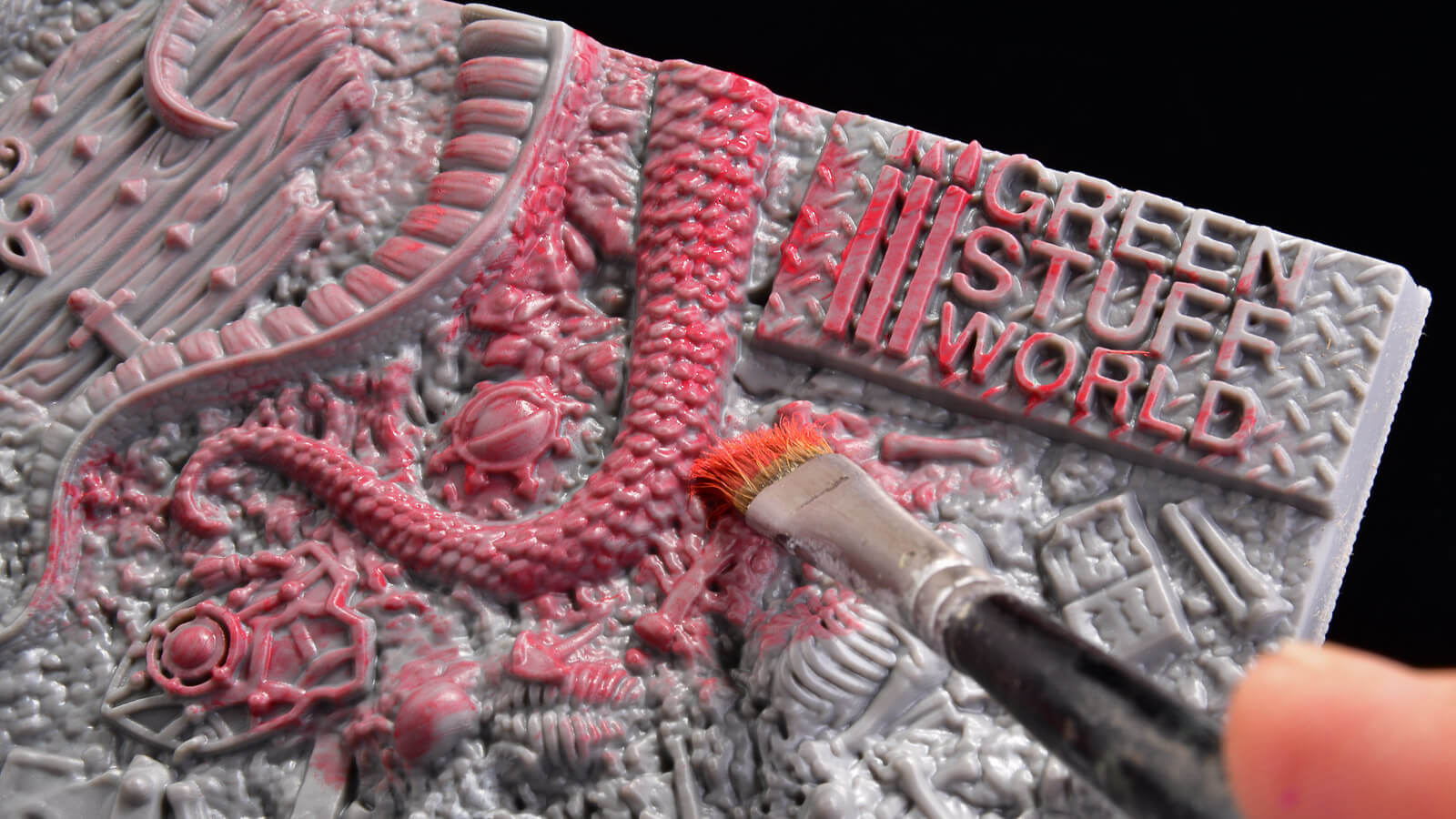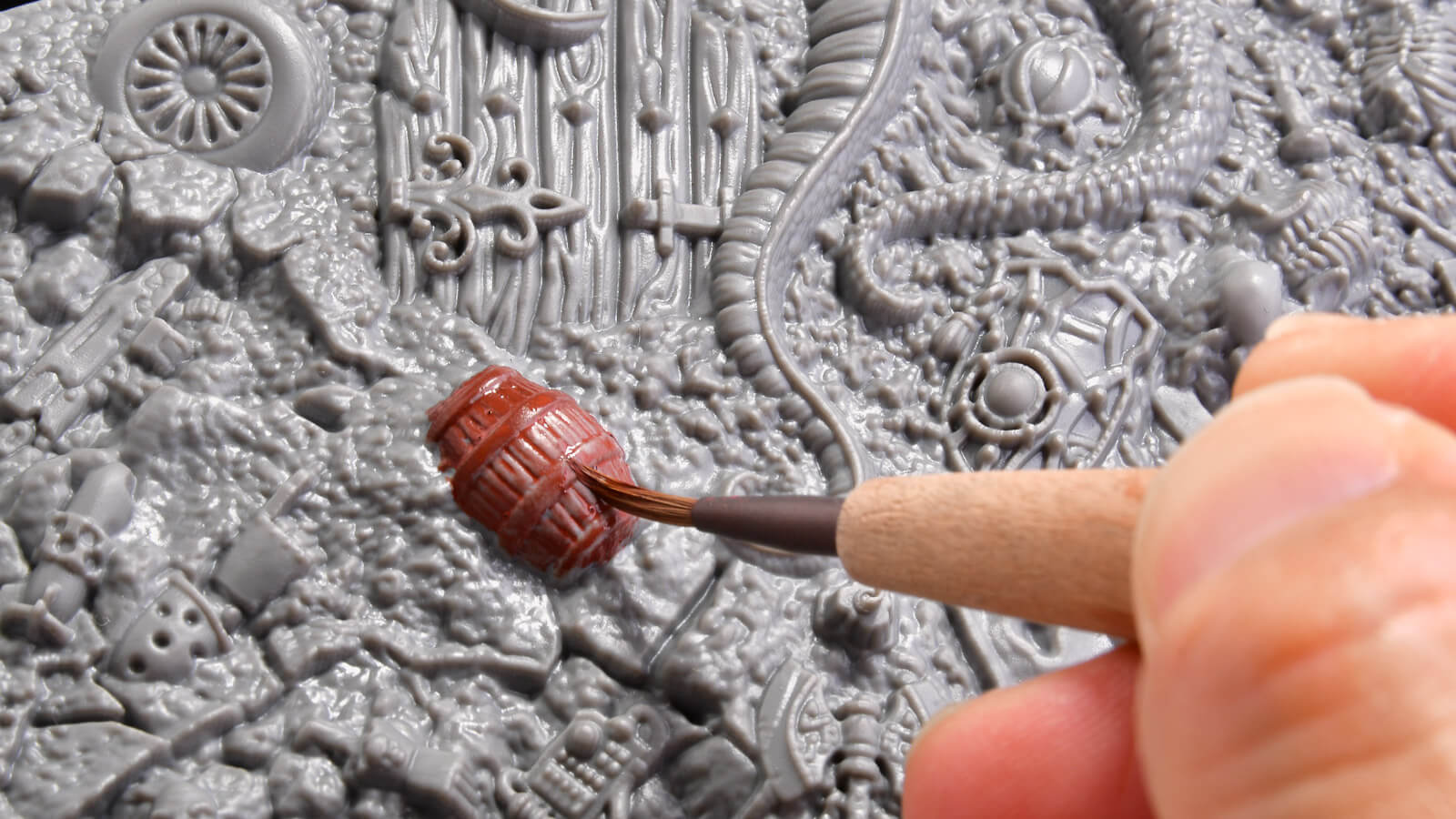 ファンタジーな武器や深海のモンスター、骸骨などが所狭しと彫刻されているこの板。これ「パレット」なんです。その名も「ドライブラシテクスチャパレット」。ユニークな模型工具や塗料を展開しているメーカー・グリーンスタッフワールドのアイテムです。