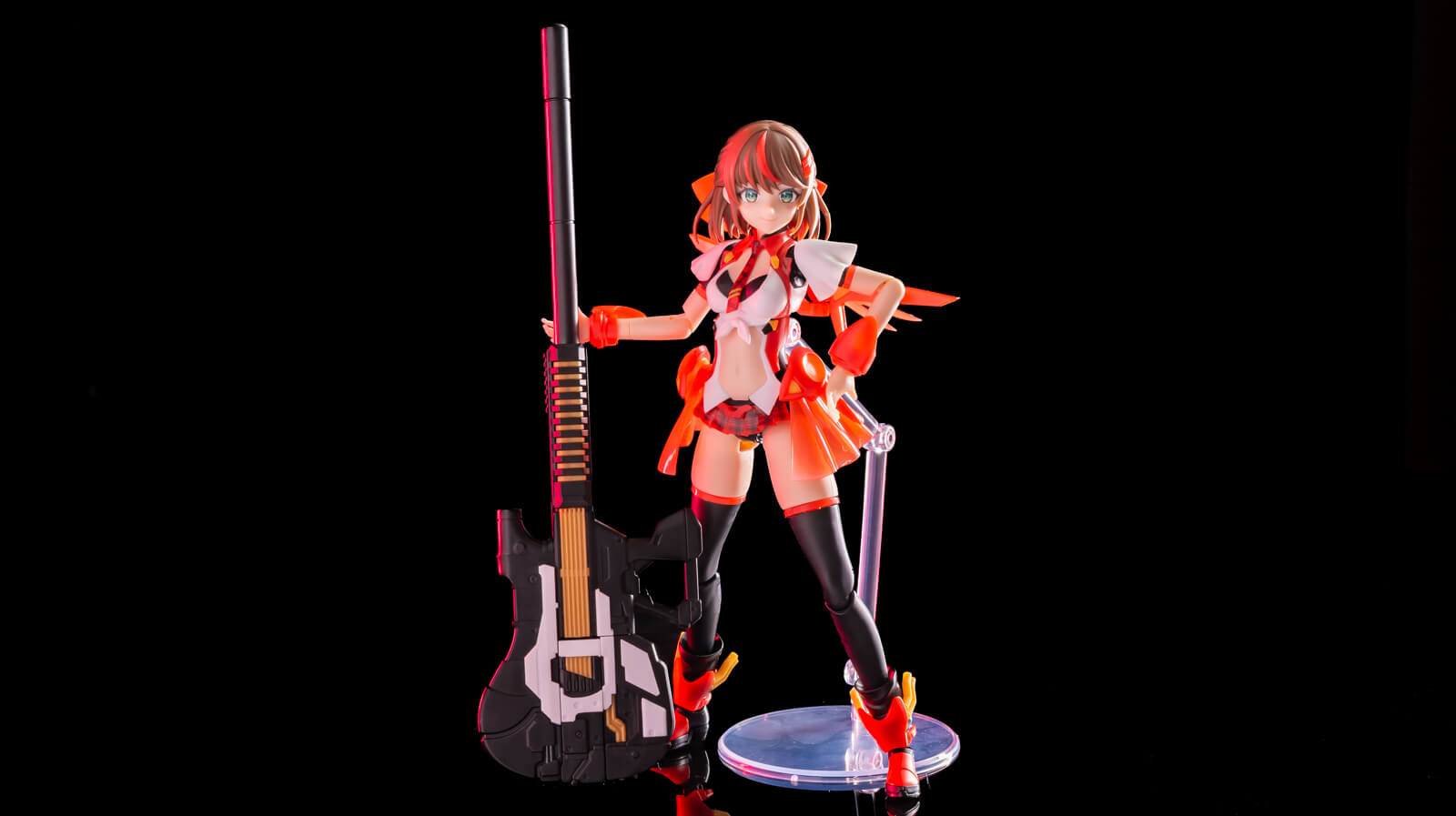大型のギターは、もはや最初から武器然とした存在感。楽器モードのまま振り回しても絵になりますし、一部変形させてバスターキャノン形態にすれば、一気にテンションが振り切れます。完成見本のポーズを真似するだけでも楽しいですし、自分なりに構え方を工夫する余地も十分。ガールズプラモとしての「遊び」がしっかり詰まっています。