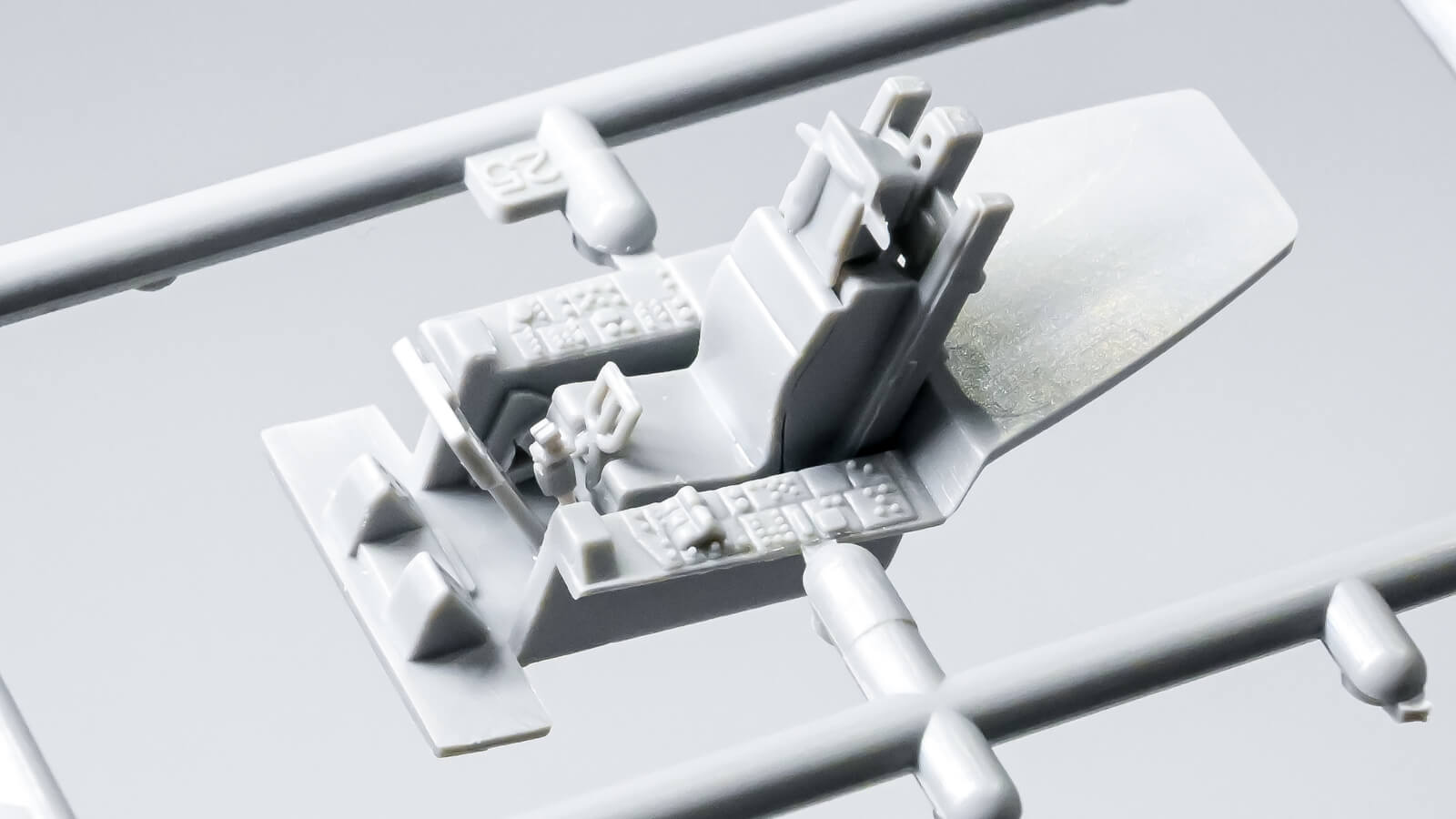 ステルス性が重視される現代の戦闘機は、曲面主体の滑らかな外形を持つものが多く、プラモデル化にあたっては胴体と主翼を一体化した大きなパーツ構成になることが珍しくありません。本機YF-23もその例に漏れず、箱を開けると、主翼を含めて上下二分割された機体パーツが収められています。そのため、組み立て作業の主役になるのはコックピットと尾翼。程よい情報量のコックピットを組み上げたあと、続いて2枚の尾翼を組み立てます。ここで少し面白いのが、その取り付け方法。尾翼中央の軸一本を胴体側パーツで挟み込む構造になっており、「これはどの角度で固定するのが正解なんだろう?」と一瞬考えてしまいます。
