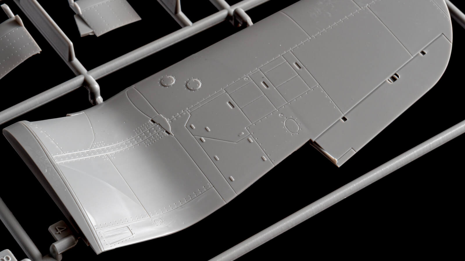 フラップはすべて下げた状態で固定。ガッチリした取り付け用のダボがあるので組み立てもスムーズだし、とにかく味が濃い。機体表面のディテールは必要最小限ですが、わりとくっきりしたスジ彫りが好印象でございます。とりあえず飛行機のカタチになるところまではなんの問題もなく組み上がります。
