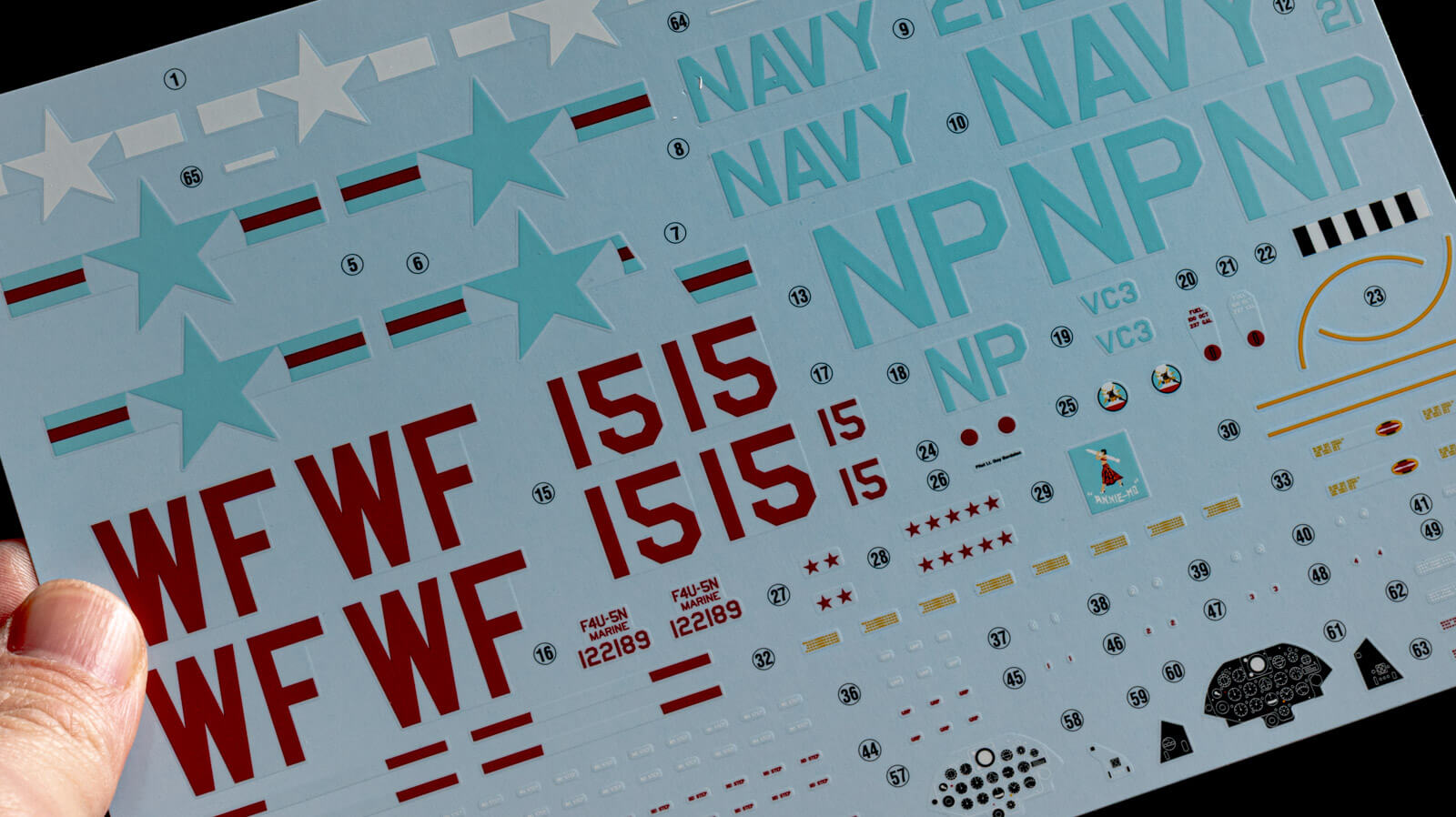 昔からハセガワの完成写真を見るたびに「なんか全体に青みがかった写真だなぁ」と思っていたのですが、そもそもグロスシーブルーの機体に水色のレターが入る機体なのでデカールを見て初めて「写真が正しかったんだ!」ということに気づくんですね。実際に手に取るまでわからんし、真っ黒に赤のマーキングが入った機体もカッコ良さそうだし、デカールが製作意欲をムクムクと育ててくれる好例と言えましょう。