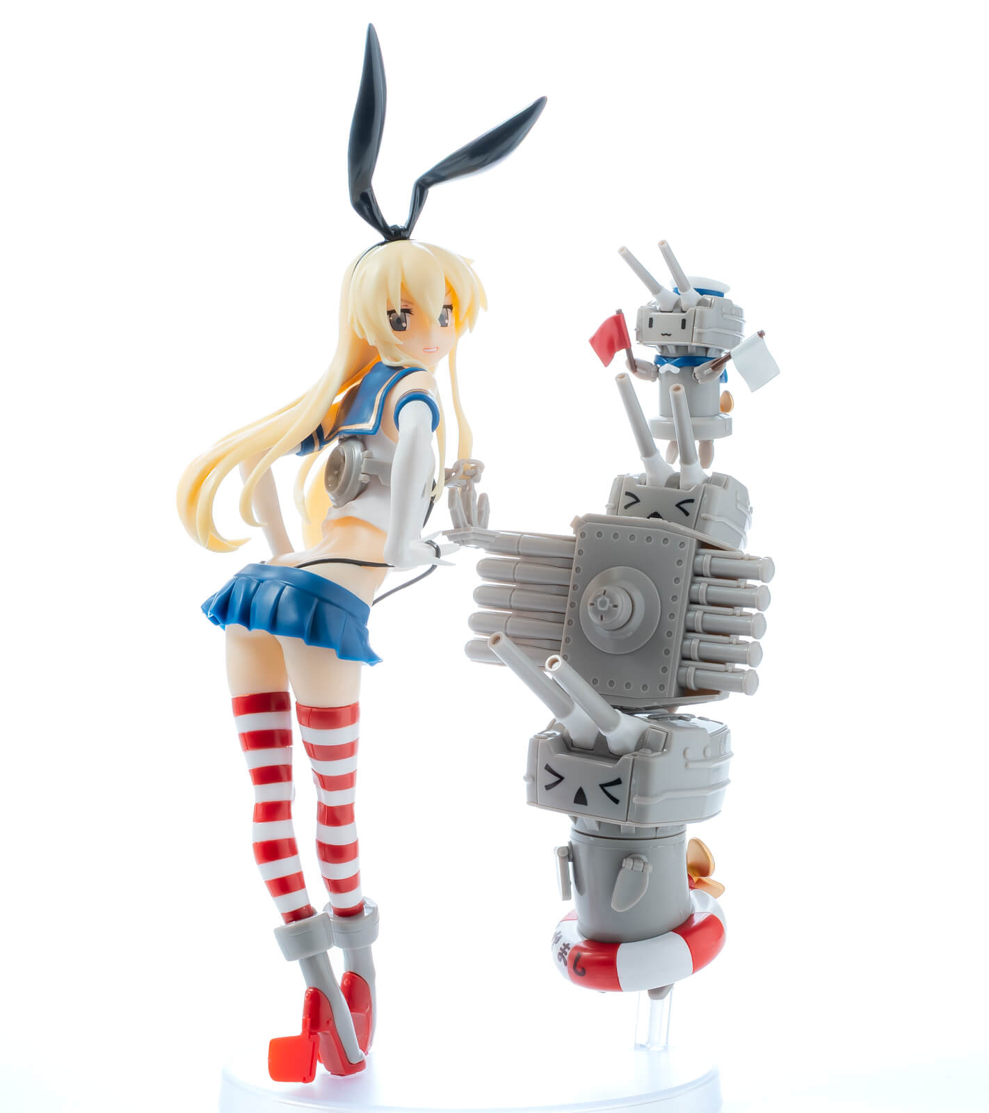 改めて2014年の塗装済み完成品フィギュアの写真を眺めてみると、当然ながらシマシマニーソは塗装表現だし、肌にはシャドウが吹いてあったり連装砲は濃淡のグレーが使い分けられていたり砲口がブラックアウトされていたりと、細かい技が光りまくっているんですよね。プラモデルで再現されているのはキャラクターの基本的な造形とカラーリング……と考えると、ここからさらに手を加えてブラッシュアップできるところは無数にあります。かつての名作フィギュアが目指した高みを思い起こしながらこのプラモデルを磨き上げるのも楽しみな、奥行きの深い一作と言えるでしょう。みなさんも、ぜひ!