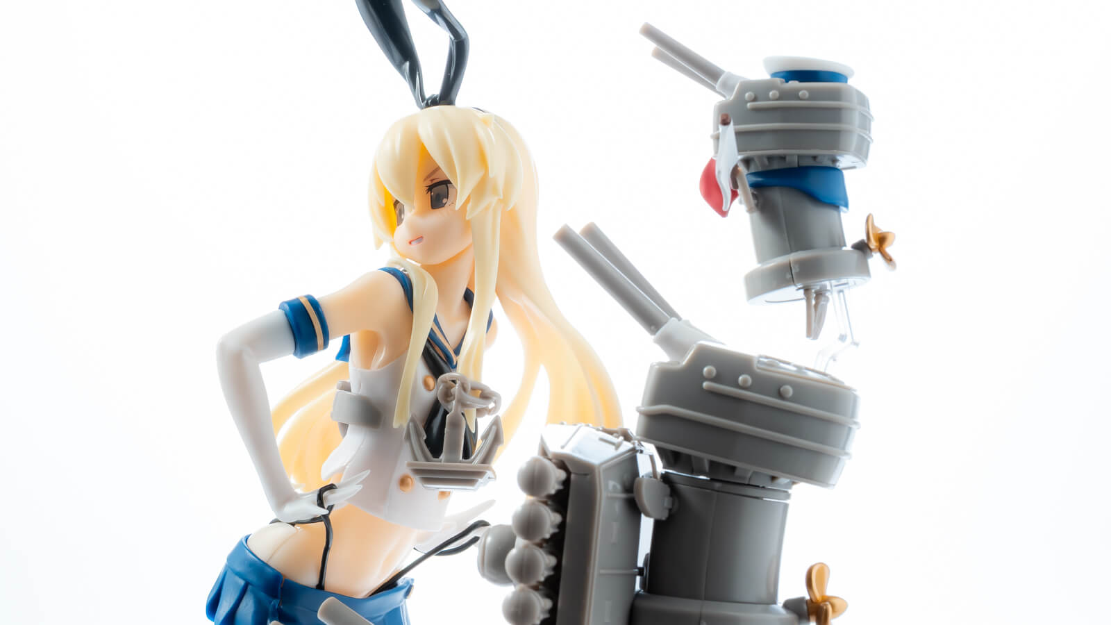 完成してみればスリムな島風にメカニカルなディテールとコミカルな表情の連装砲ちゃんが寄り添い、かなりボリュームのある景色が広がります。各部の質感はさすがにプラスチックモデルなりのツヤだったり、合わせ目が気になるところも散見されます。しかしこうして写真に撮ればしっかりと「あの島風のフィギュアだ!」と感じられるのですから大したもの。でもね……。