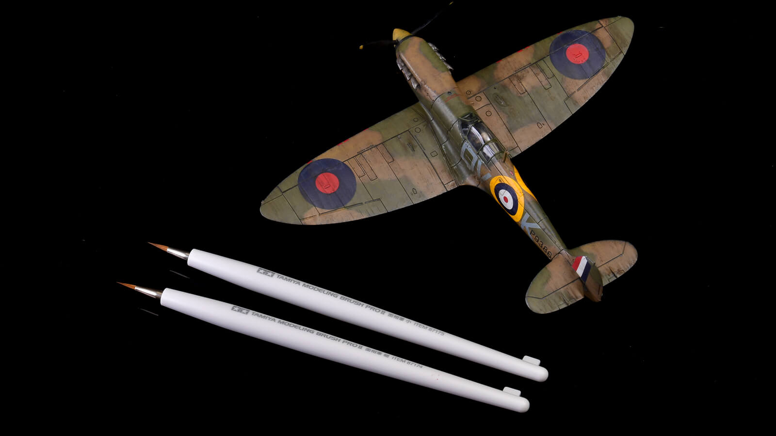 この「タミヤ モデリングブラシPROII」の「小」と「細」があれば、広い面積から細かい面積まで楽しく筆塗りできます。このスピットファイアもこの筆の「小」と「細」だけで塗っています。良い筆が欲しいと聞かれたから、必ずお勧めする筆です。