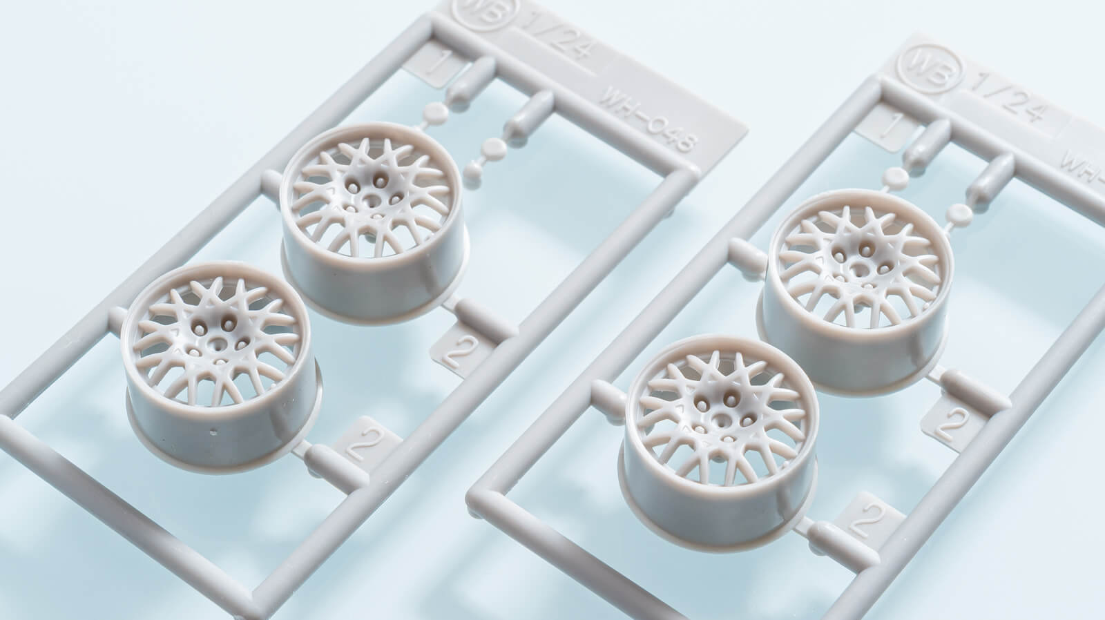 新規造形のメッシュホイールはグレーのプラスチックなので指定通りシルバーに塗装したいところ。ボディの塗装指示は自社コラボならではの矜持というかこだわりを感じさせるやたらと複雑な3層コート指定となっています。とはいえ、ボディパーツは最初からメタリックカラーのプラスチックなのでそのままデカールを貼るだけでも雰囲気を充分味わえる内容になっているのがミソ。