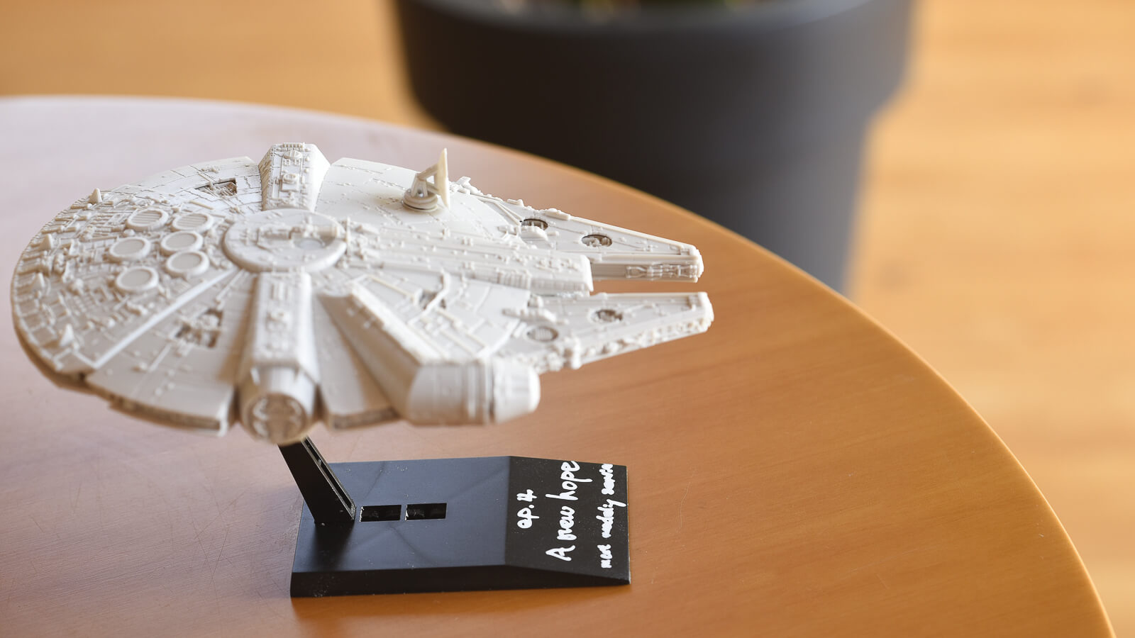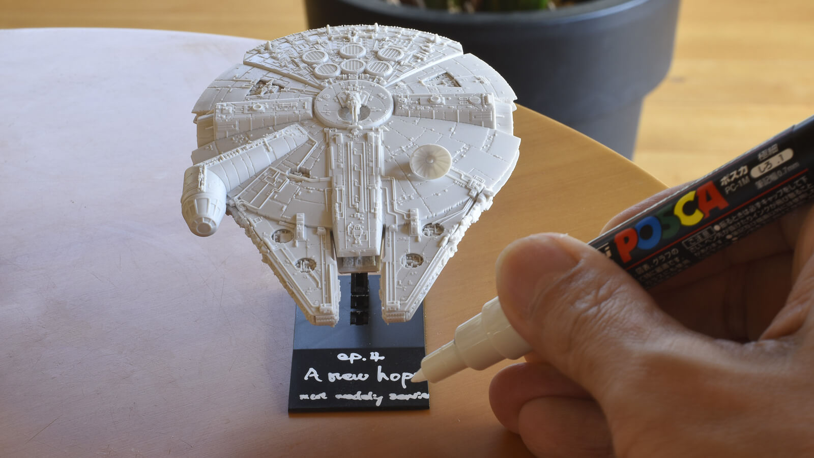 これはビークルモデル のミレニアム・ファルコン。パチパチっと組んで、その精密なモールドを十分楽しんだところで「完成宣言」。キット付属のディスプレイスタンドにスター・ウォーズのタイトルを書き込んで製作を締めくくった。タイトルはポスカの 極細 ・白を使って書き込んだ。結構細く書けるのでこんな狭いところでもなんとかなる。読めなくっても気にしない。すごい、これだけで誰かが作った作品に見える!(あ、自分で作ったんだった。)