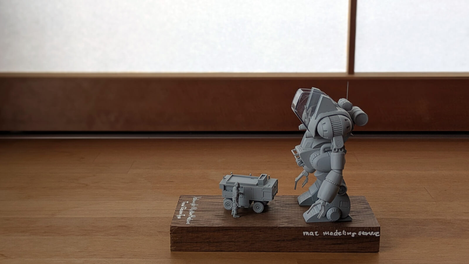 これはHG1/144ガンダムTR-6。これも説明書通りに組み始めたものの、よく眺めていた設定イラストの格好よくも愛らしいフォルムが再現されていて、本体を組んだところで満足。100均で買った木片にちょっと茶色で色付けした上にポスカで機種名をサラサラっと。キットは最後まで組んでないけど、かえって自分らしいお気に入りになった。