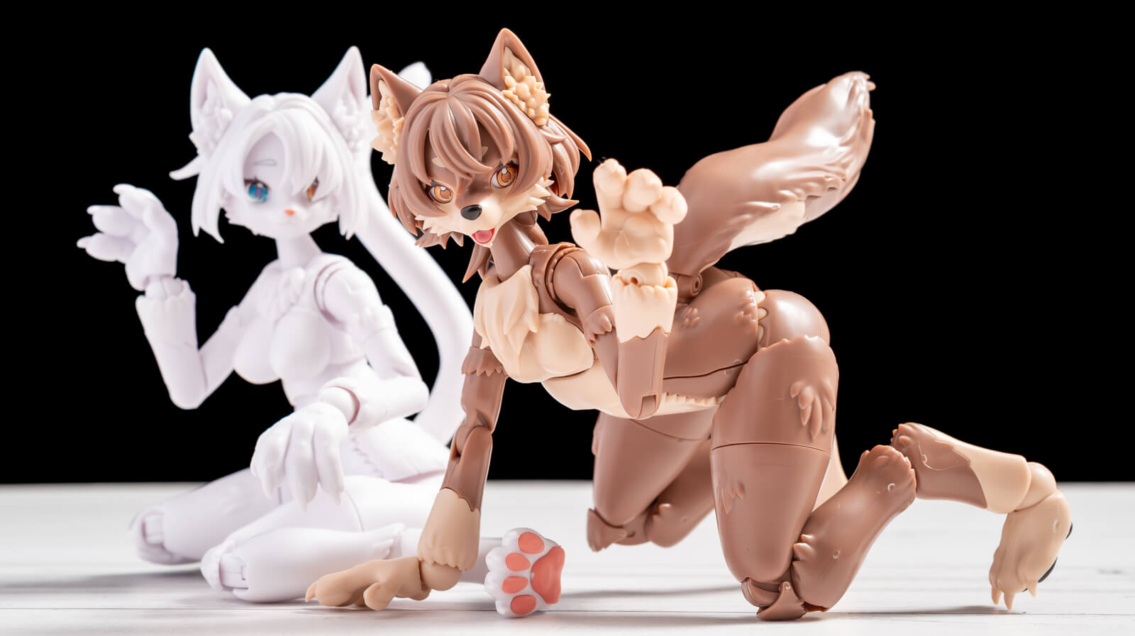 しかし身体の各所をよく見ると、モフッとした毛の彫刻が施されていたり、尻尾が生えていたり、手足に肉球が付いていたりして、さらに顔、腕、脚は複数種類が用意されていることに気が付きます。つまるところ、「1パターンにしか組めない素体に別売のカスタムパーツを盛る」という構成ではなく、ひとつのパッケージのなかであれやこれやと組み換えをしてユーザーが好みの形態を探る……という遊び方が提案されているのです。それからさきほど「人間型のボディ」とは言いましたが、スネに逆関節(動物で言うカカト)が入っているので人間とは違う動きをするのがまた面白いのだぜ……。