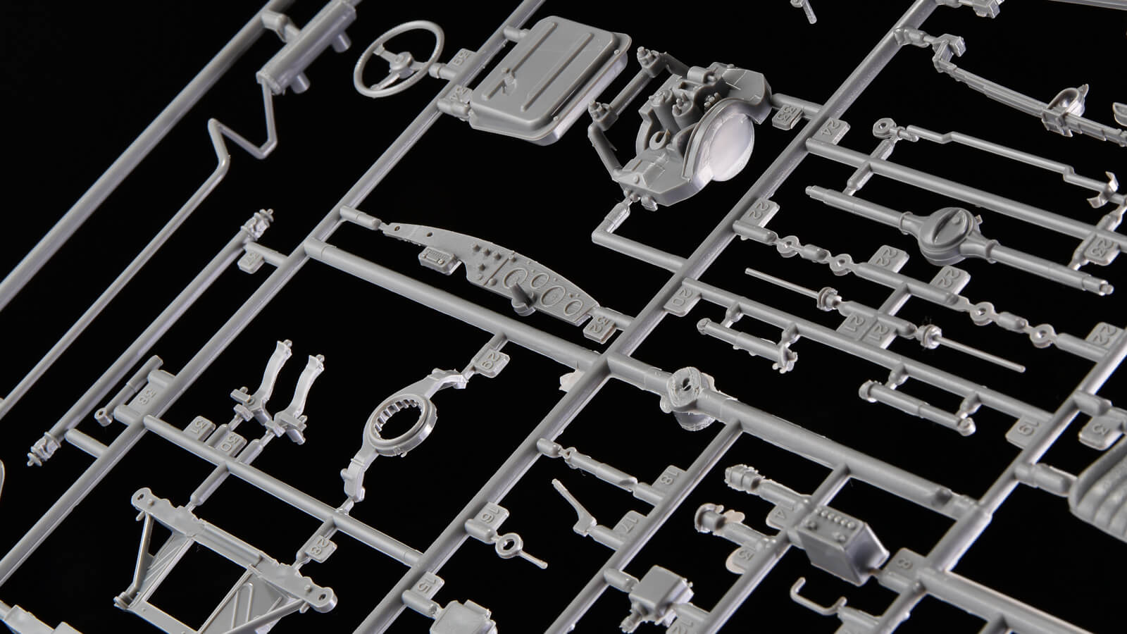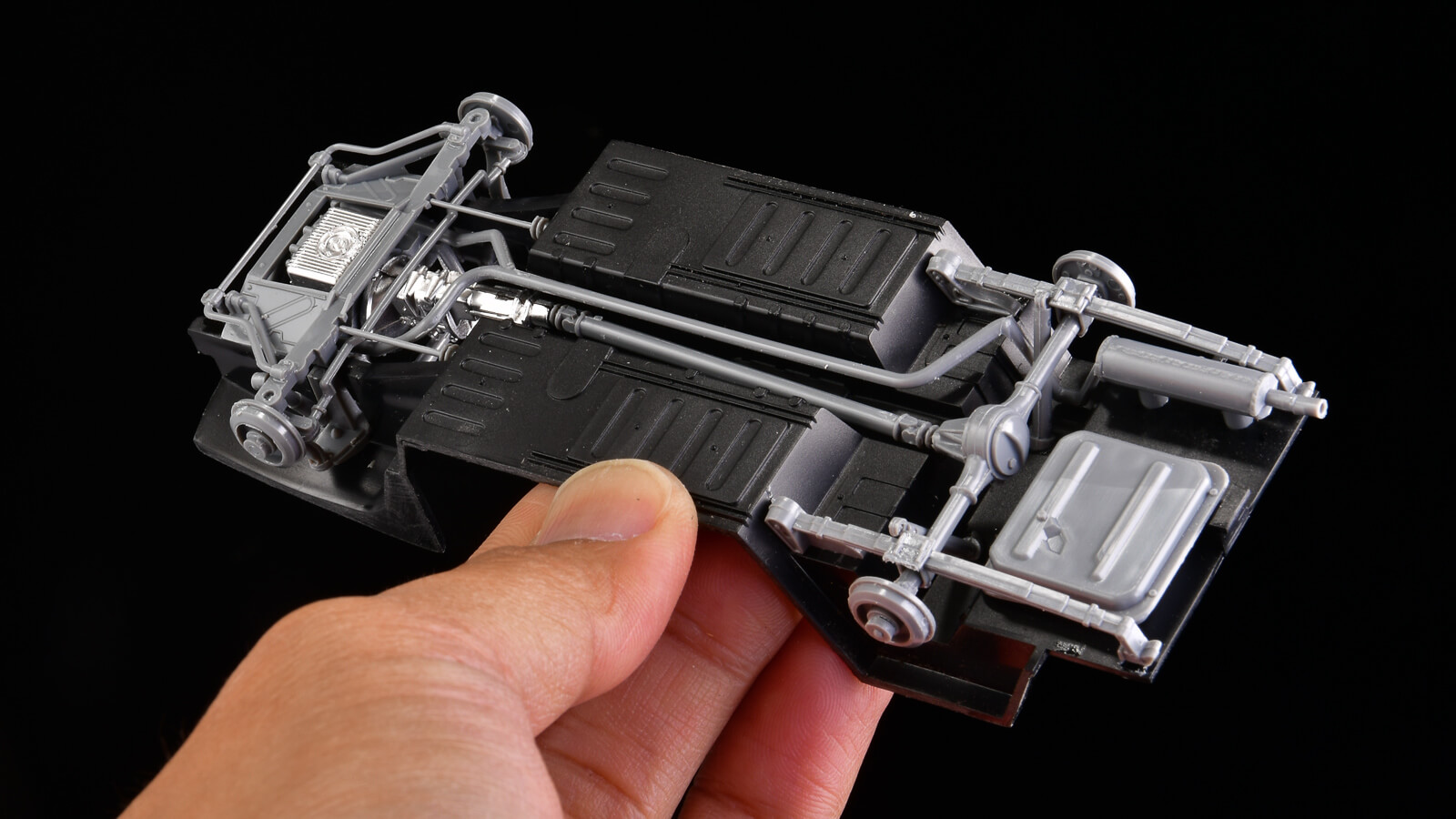 足回りやエンジンなどが現代の車模型のように細かくパーツ分けされています。少しパーツにパーティングラインやバリが残っていたりしますが、そこを整えてあげるだけで、パーツの良さが一気に上がります。パーツ同士の組み合わせも癖がなく、すんなりと組めていけますよ。