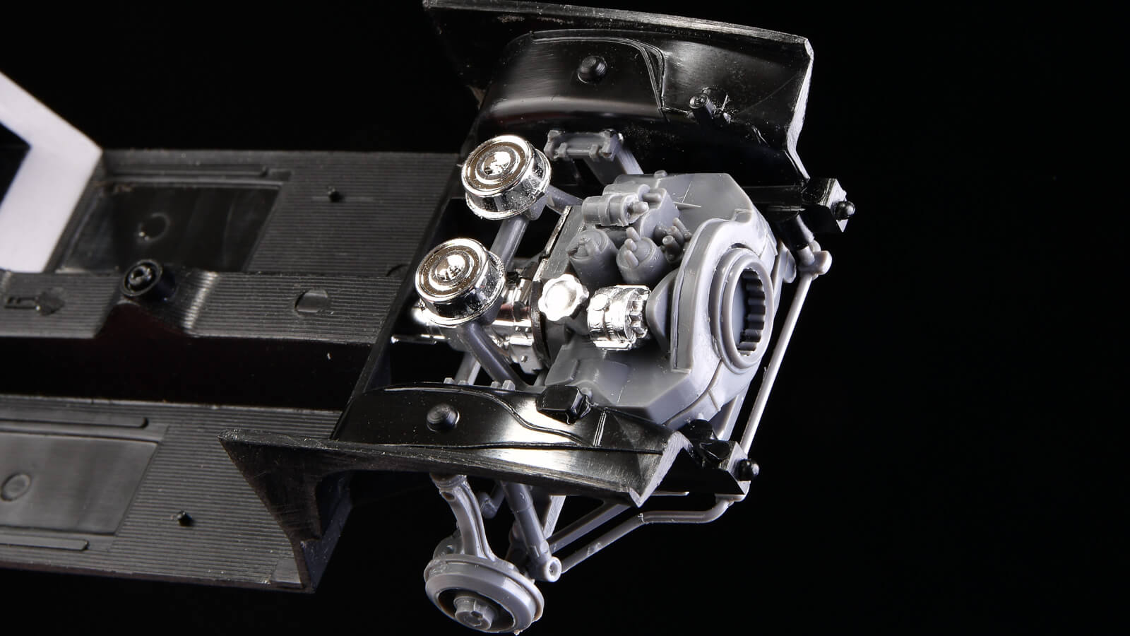 これだけ素敵なエンジンがあると、前のフードを開けた状態で作りたくなりますね。そんな意欲も掻き立ててくれる素敵なプラモデルです。