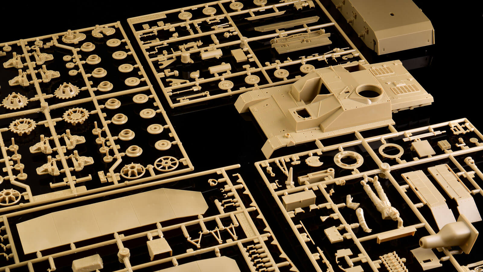 もっとあっさりしたキットなのかと思いきや、脱着可能なシュルツェン(車両の両サイドに装着されたシールドのようなもの)、多数の車外装備品、ポリキャップ接続による転輪と、今と変わらないフォーマットでみっちりとパーツが詰め込まれています。