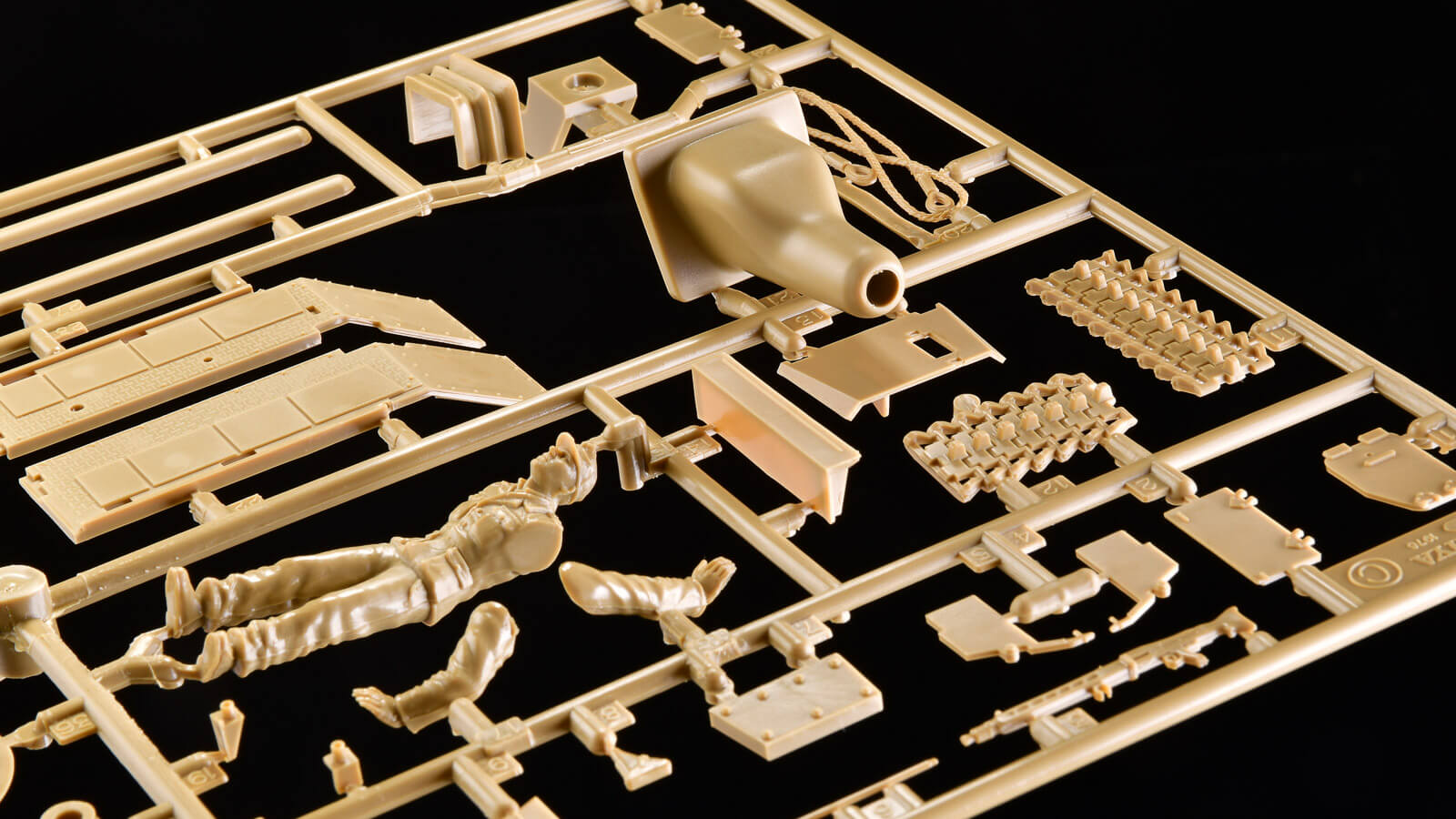 本キットの特徴の一つである「ザウコプフ」(豚の頭)と呼ばれる防楯も、ランナーの中で存在感を発揮。袋に入るように成型後、手でぐいっと曲げらているので、「俺はここにいるぞ!」とばかりに主張しています。