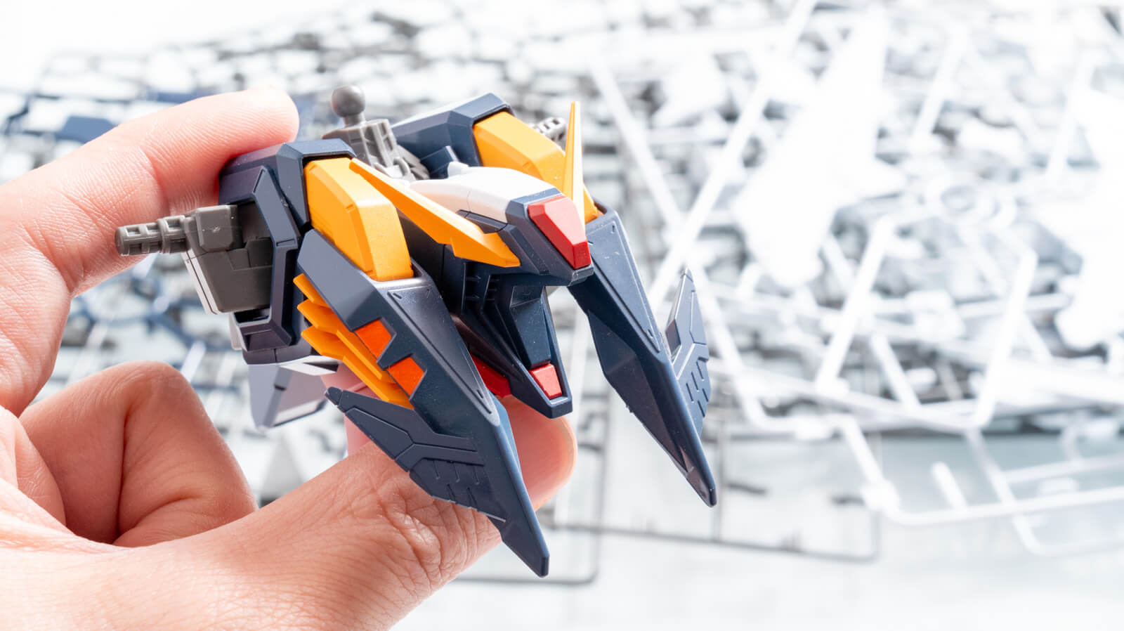 黄色とオレンジのパーツは理想の色で塗装済み。ランナーのまま丸吹きしたパーツもあればご丁寧にマスキングして塗り分けてあるところもあるし、シールに塗料を吹き付けてベタッと貼ったところもある。なんせ4年前のことなのでどこがマスキングを使った塗り分けでどこが塗装済みシールを貼り付けたところなのか全然見分けが付かない。ガハハ。nippperに記事を書いておくと自分が何をしたのか思い出せていいな。