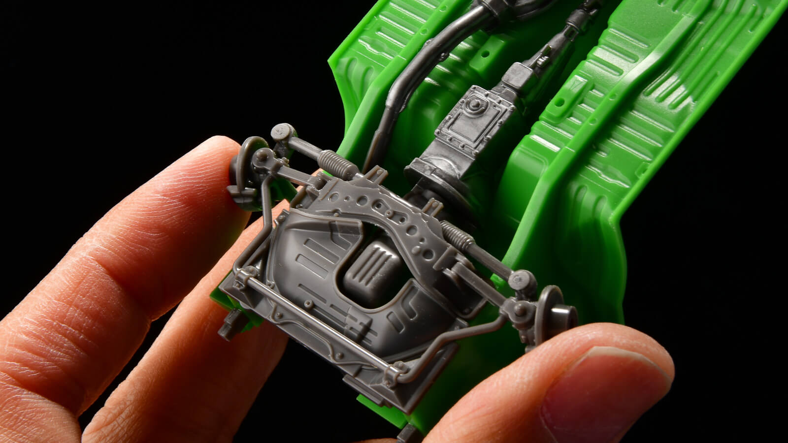 そのためこのように可動ギミックが入っている足回りも、特に苦労することなく組めます。可動ギミックが入っている箇所は、接着剤を塗らないのですが、そのようなパーツもプラの嵌合である程度と止まってくれるので、組み立て中にぽろぽろと落ちたり外れたりすることはありませんでした。